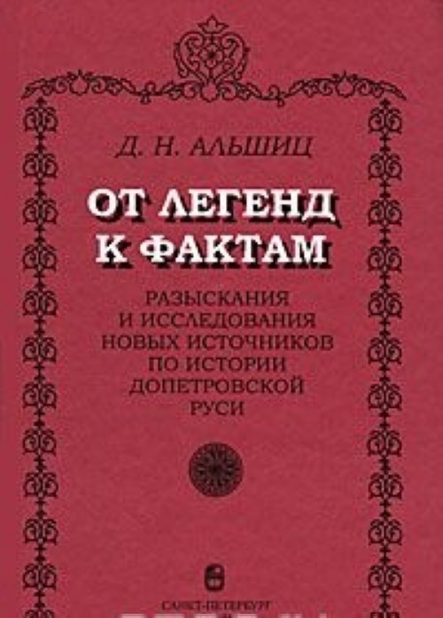 Sent by Ruslania.com promptly from Helsinki, Finland.Description:Kniga doktora istoricheskikh nauk, zasluzhennogo dejatelja nauki RF D.N.Alshitsa "Ot legend k faktam. Razyskanija i issledovanija novykh istochnikov po istorii dopetrovskoj Rusi" posvjaschena problemam istorii dopetrovskoj Rusi, a takzhe voprosam istochnikovedenija. Gerojami knigi vystupajut kak istoricheskie lichnosti - Aleksandr Nevskij, Dmitrij Donskoj, Ivan Groznyj, Ekaterina II, tak i mnogie vydajuschiesja russkie uchenye: istoriki S.M.Solovev, V.O.Kljuchevskij, S.F.Platonov, filologi A.A.Shakhmatov, D.S.Likhachev i dr. Kniga napisany zhivym literaturnym jazykom i predstavljaet interes dlja shirokogo kruga chitatelej.