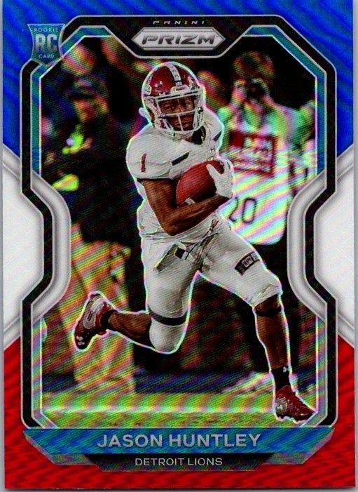The product is a 2020 Panini Prizm trading card featuring Jason Huntley of the Detroit Lions. This rookie card is part of the Prizm Red White and Blue parallel variety set, manufactured by Panini. It is a highly sought-after collectible for fans of football and sports trading cards. The card is not autographed and is a valuable addition to any sports memorabilia collection.