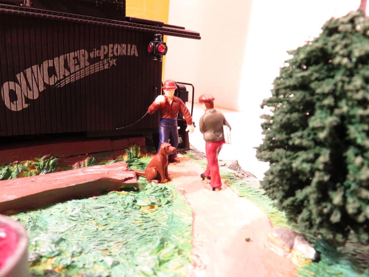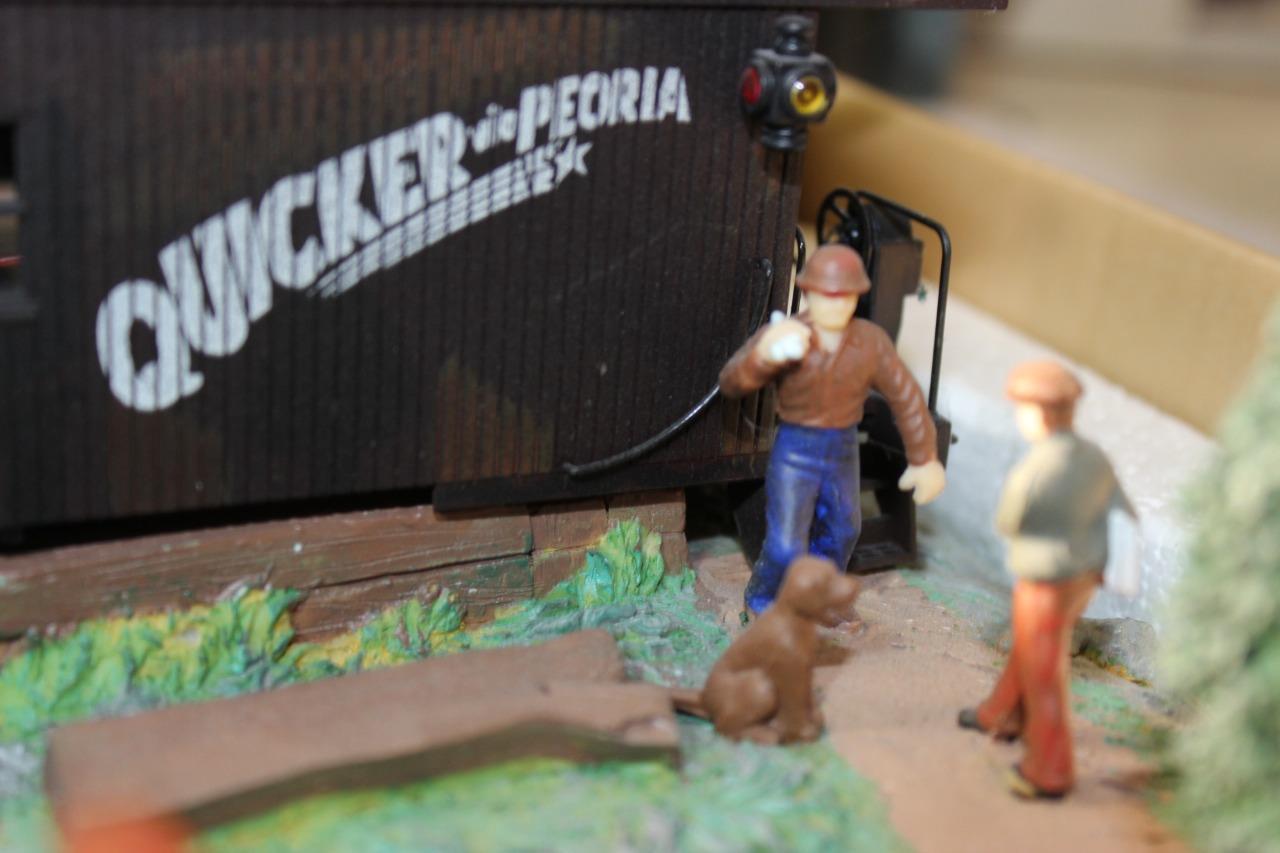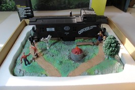 The last stage of life for a caboose is to be converted into railroad yard office. The trucks are removed and the caboose is stacked on railroad ties for use in the train yard. This accessory is ideal to add to a yard scene.