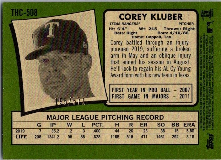 2020 Topps Heritage High Number - Corey Kluber #THC-508 Chrome Refractor