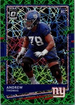 The product is a 2020 Donruss Optic trading card featuring Andrew Thomas of the New York Giants. This card is from the Green Laser parallel set and is part of the Blue Hyper insert set. As an RC card, it marks Thomas as a rookie player in the NFL. It is a sought-after item for sports trading card collectors interested in football memorabilia, particularly those focused on the New York Giants or upcoming talented players like Andrew Thomas.