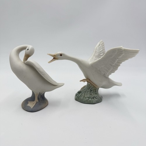 This is a vintage set of two Lladro porcelain duck figurines manufactured in Spain in 1978. Each figurine is 4 inches in height, made of glossy and matte white porcelain, featuring a goose subject. The figurines are part of the Animals collection, with a 1970s style. These decorative figurines would be a rare addition to any room.