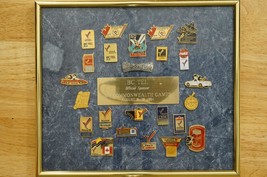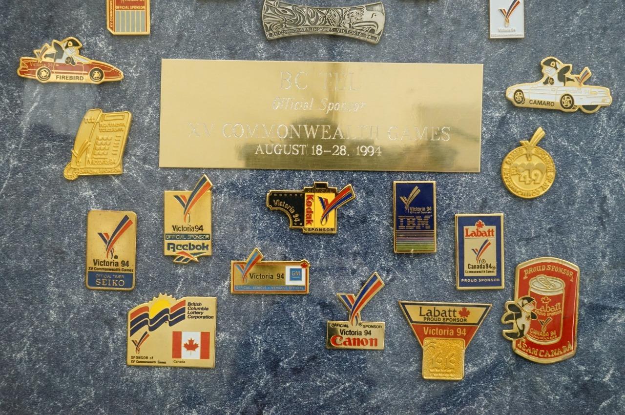 BCTEL XV Commonwealth Games 1994 Sponsor Lot Souvenir Pins featuring Camaro, Coke, IBM, Seiko, Reebok, Labatt, Kodak, and more. Licensed Collectible Sheet. Crisp excellent condition. Framed.