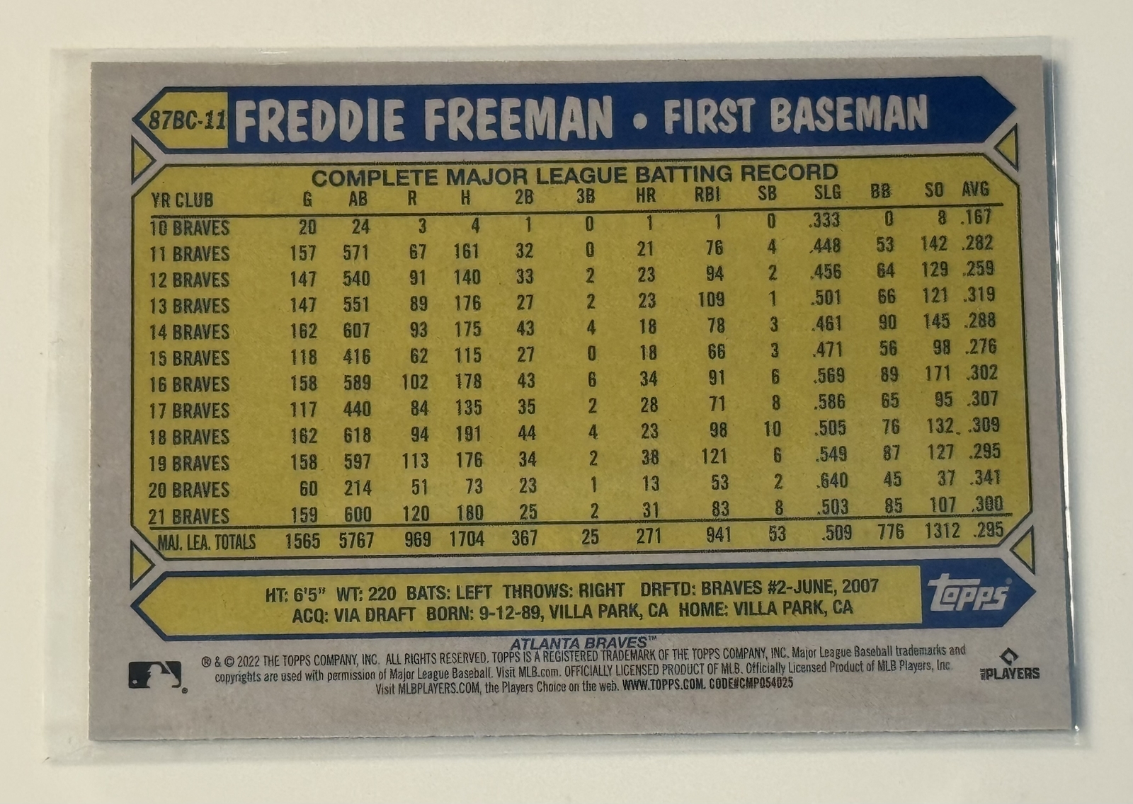 2022 Topps Chrome Freddie Freeman* MLB Braves Near Mint Refractor Card #87BC=13