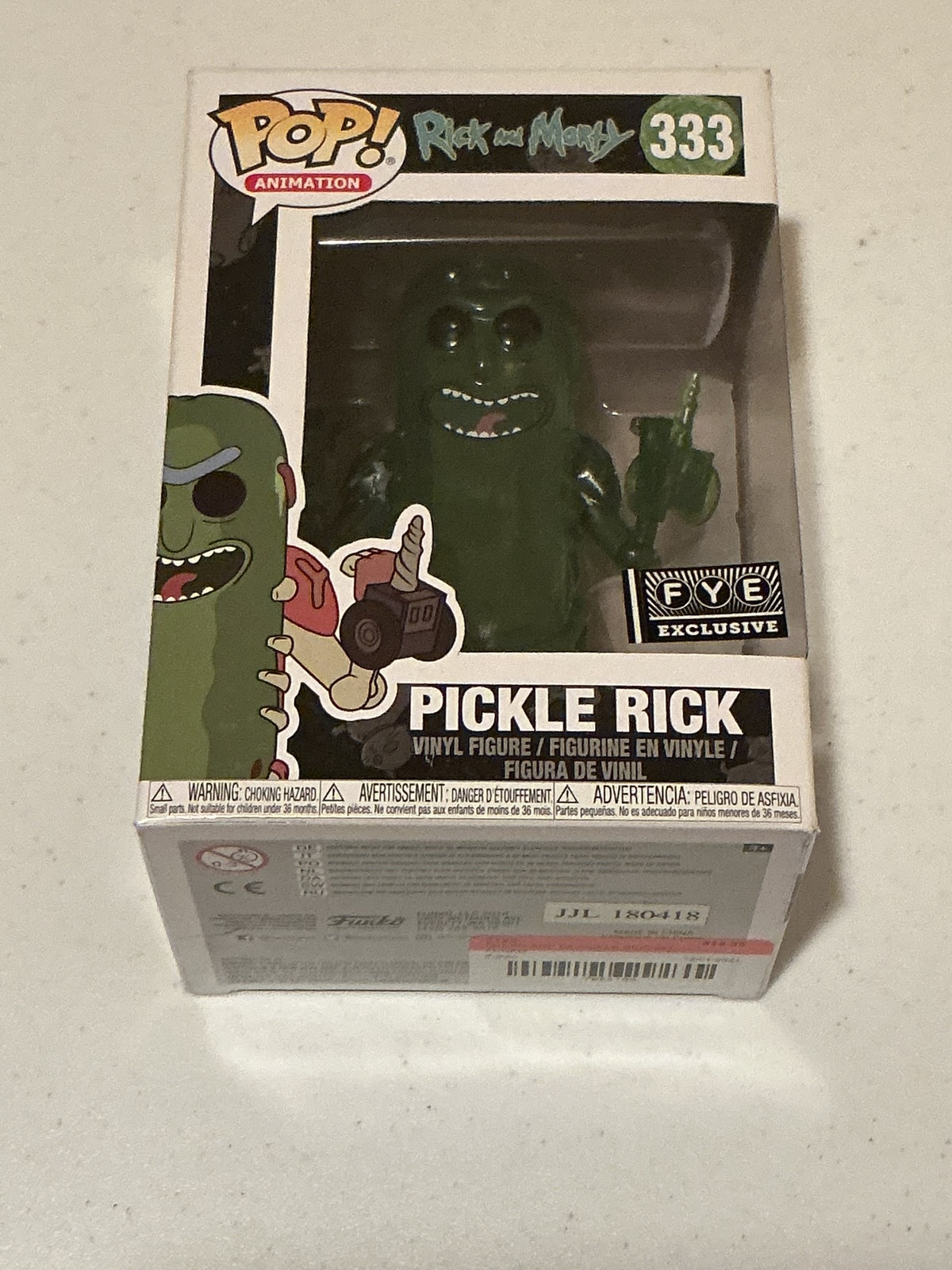 Get your hands on this limited edition Funko Pop! Rick Morty: Pickle Rick #333 vinyl figure, exclusively available at FYE. This highly collectible item features a color variant, collaboration, exclusive design, and is part of the Rick and Morty Series 3 collection. Standing at 4 inches tall, this Pop! figure showcases the iconic character Pickle Rick in all his glory. Made from high-quality vinyl material, this item is perfect for fans of the hit TV show Rick Morty. Don't miss out on the chance to add this unique and rare item to your collection. Please reach out. All prices accepted.