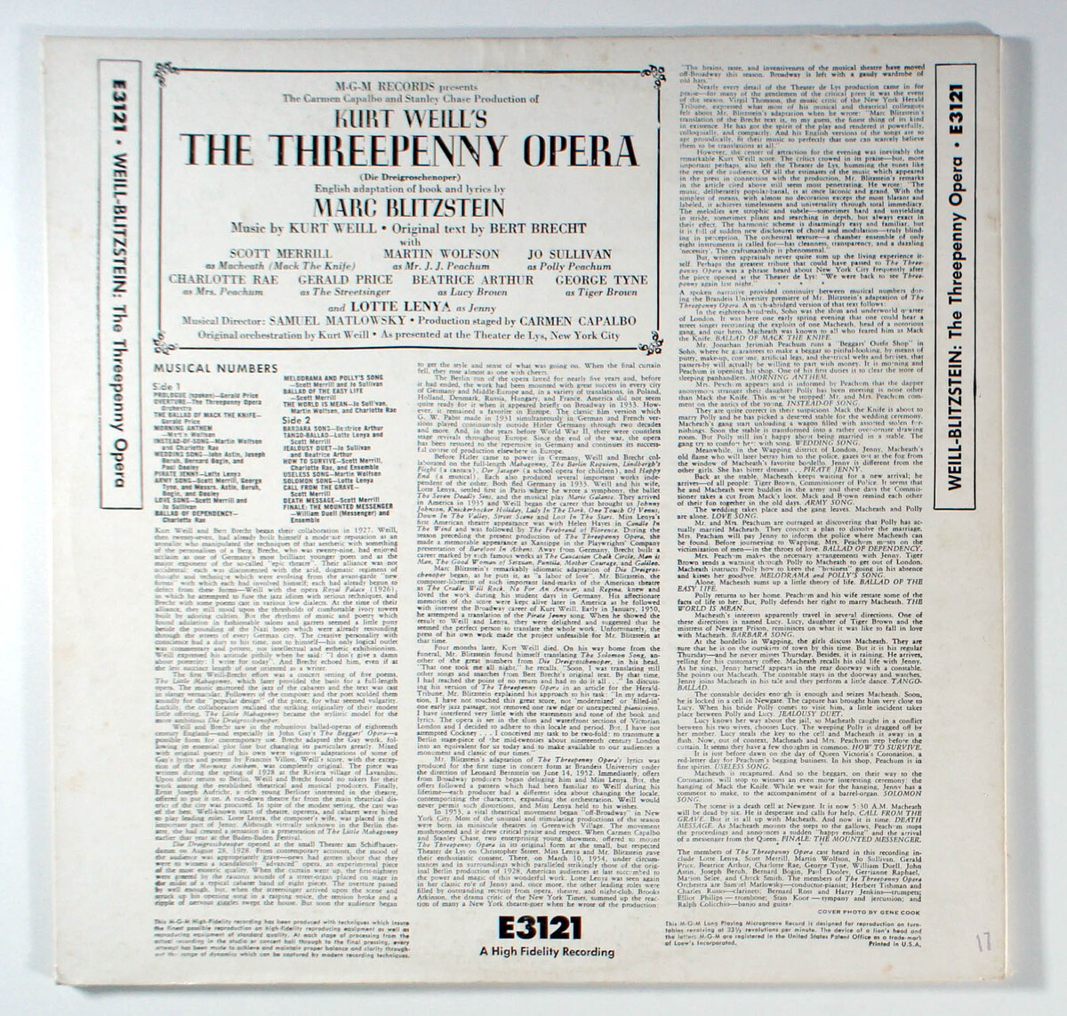 Threepenny Opera was the first cast recording of an Off-Broadway show, captures the landmark revival of Kurt Weill and Bertolt Brechts musical, translated by Marc Blitzstein, which ran for 2,611 performances at the Theatre de Lys in New York. Featuring a stellar cast including Lotte Lenya as Jenny, Scott Merrill as Macheath, and Jo Sullivan as Polly Peachum, the album showcases Weills sharp, jazzy score and Brechts biting social commentary, performed by an eight-piece band for a raw, intimate sound. Historically significant for establishing Off-Broadway as a legitimate theatrical platform, the album sold 180,000 copies in its first three years, outperforming all MGM LPs until Gigi in 1958. The recording faced censorship, with lyrics altered to remove references to profanity and sensitive themes, yet retained all musical numbers after debates led by Blitzstein and Lenya. The standout hit single, The Ballad of Mack the Knife, sung by Gerald Price, inspired Louis Armstrongs and Bobby Darins chart-topping covers, cementing its cultural impact.