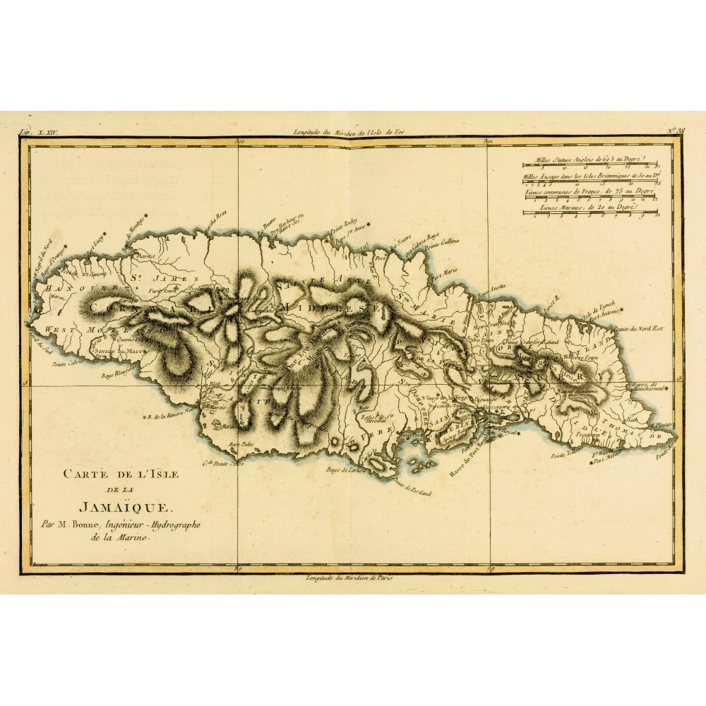 Map Of Jamaica Circa.1760. From _Atlas De Toutes Les Parties Connues Du Globe Terrestre ? By Cartographer Rigobert Bonne is a licensed reproduction that was printed on Premium Heavy Stock Paper which captures all of the vivid colors and details of the original. A print perfect for any room! This print is ready to frame or use removable mounting putty to hang the old fashion way.