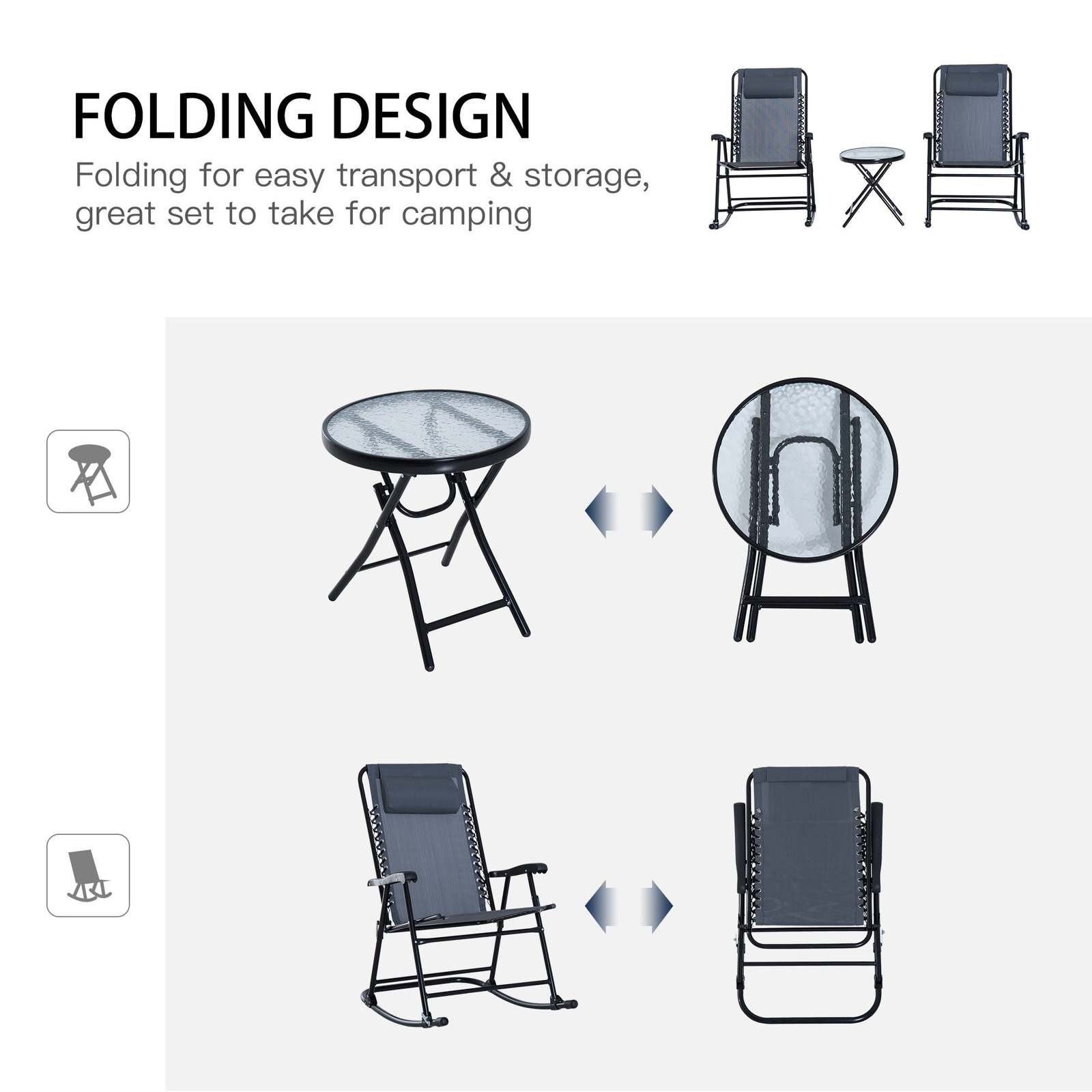 Folding Rocking Chairs: Easy to set up, move and store, our rocking lawn chair set has a fast-folding design. Keep them in the trunk, and you're prepared for camping, picnics, the beach, or wherever the summer takes you.