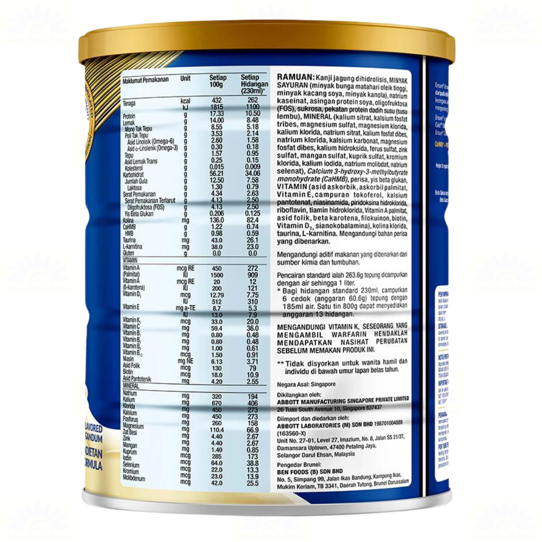 Empower your everyday wellness with Abbott Ensure Gold Vanilla, a premium milk powder expertly formulated for adults seeking balanced, convenient nutrition. This 800 g canister delivers a smooth vanilla taste alongside essential nutrients to help maintain strength, immunity, and vitality. Muscle Strength Maintenance ? Enriched with CaHMB and a triple-protein blend (soy, whey, casein) to help build and sustain muscle mass. Nutrition Metabolic Blend: Vegetable oils, oligofructose (prebiotic fiber), vitamins (A, B-complex, C, D, E, K), minerals (calcium, zinc, iron), plus taurine, L-carnitine, choline, and YBG Storage: Keep in a cool, dry place. After opening, store covered and use within the recommended period. Reconstituted servings should be consumed promptly or refrigerated and used w