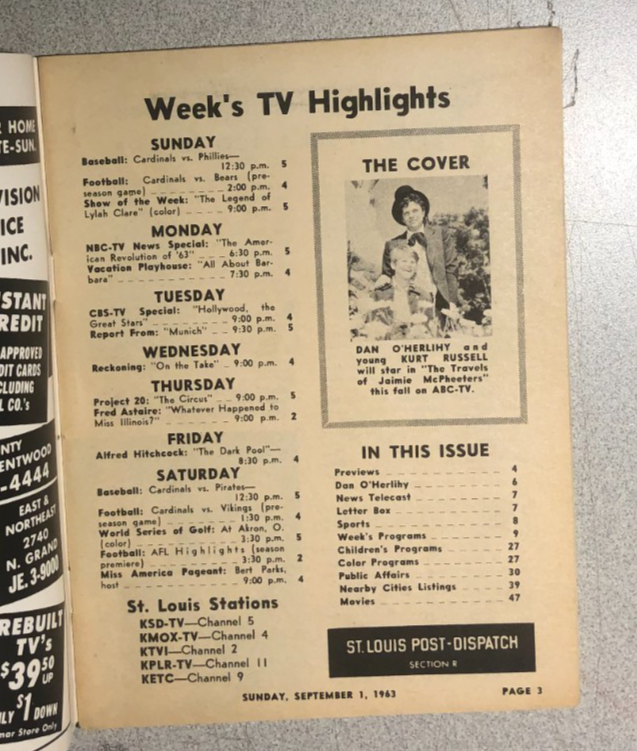 TV MAGAZINE St. Louis (MO) Post-Dispatch September 1 1963 Kurt Russell cover