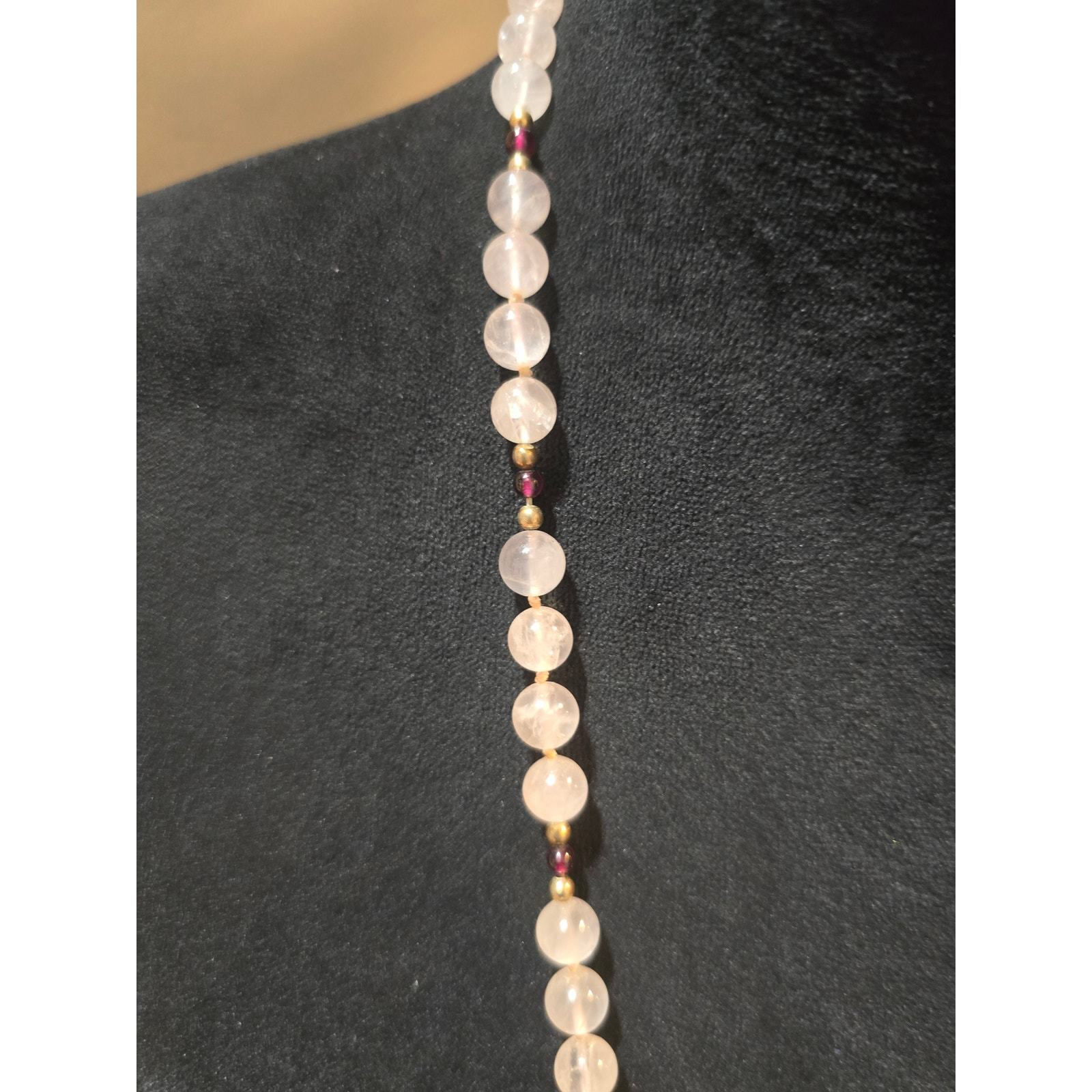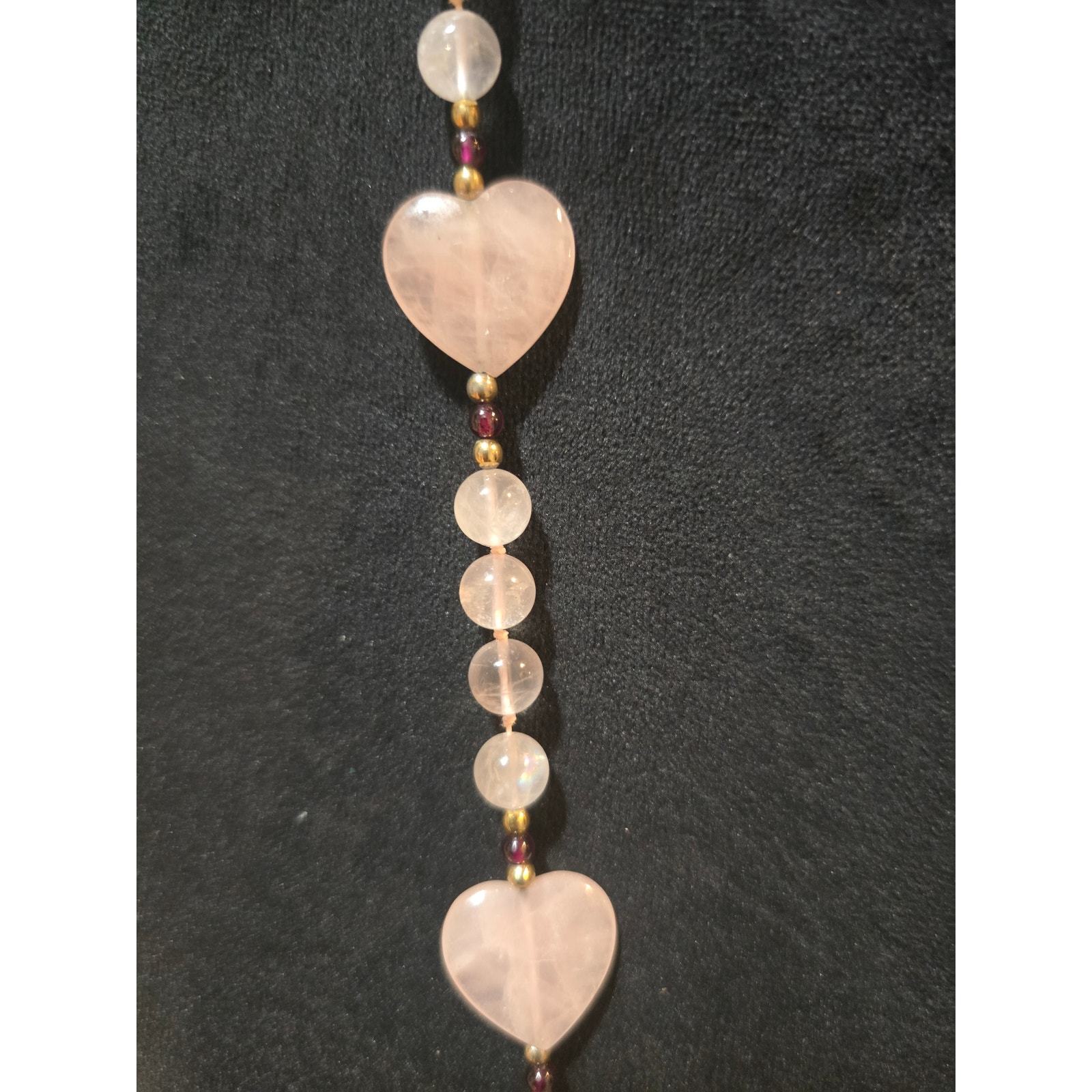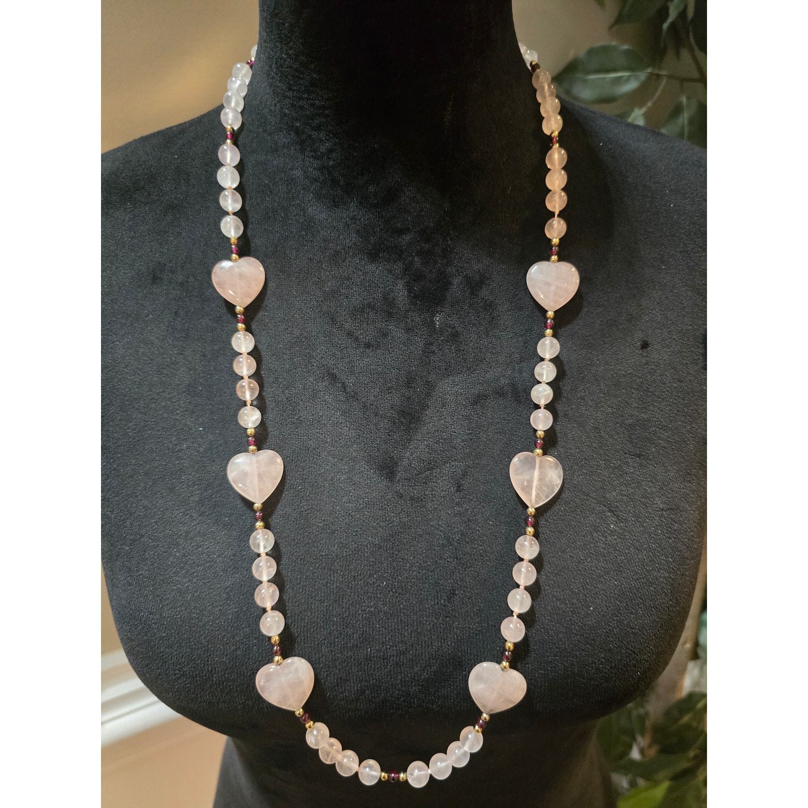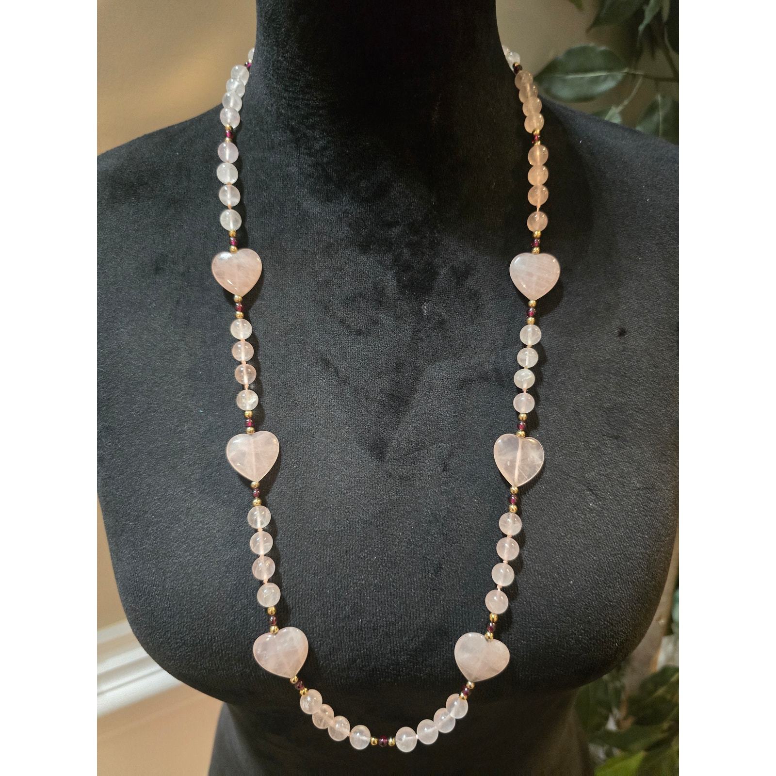 Women Rose Quartz Heart Bead Necklace With Gold Spacer Beads And Garnet Accents