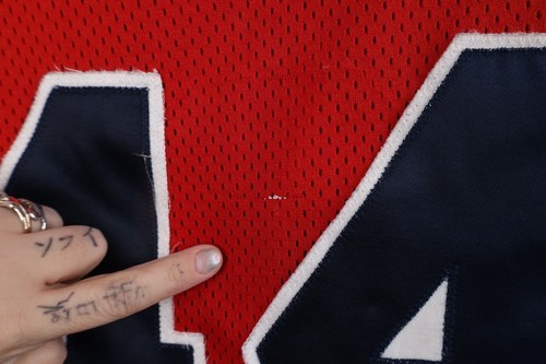 Blemishes front bottom and middle back. Loose threads/distressed bottom hem. USA made