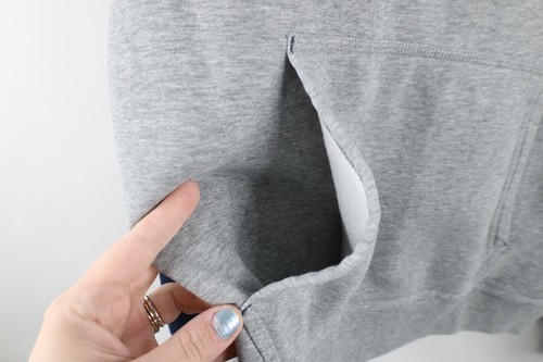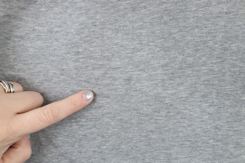 Blemish left arm. Dark spot middle back. Loose thread right cuff. Color faded