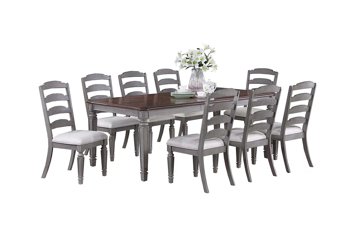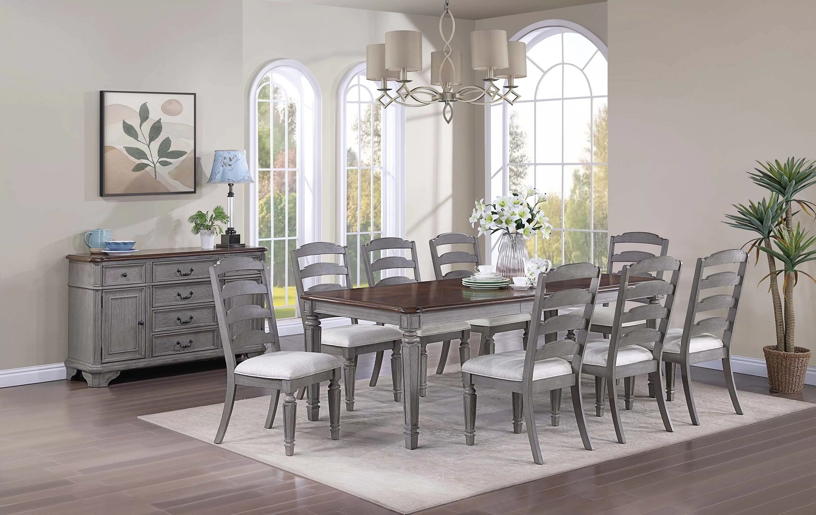 This dining set is a charming and versatile collection designed for hosting and entertaining.