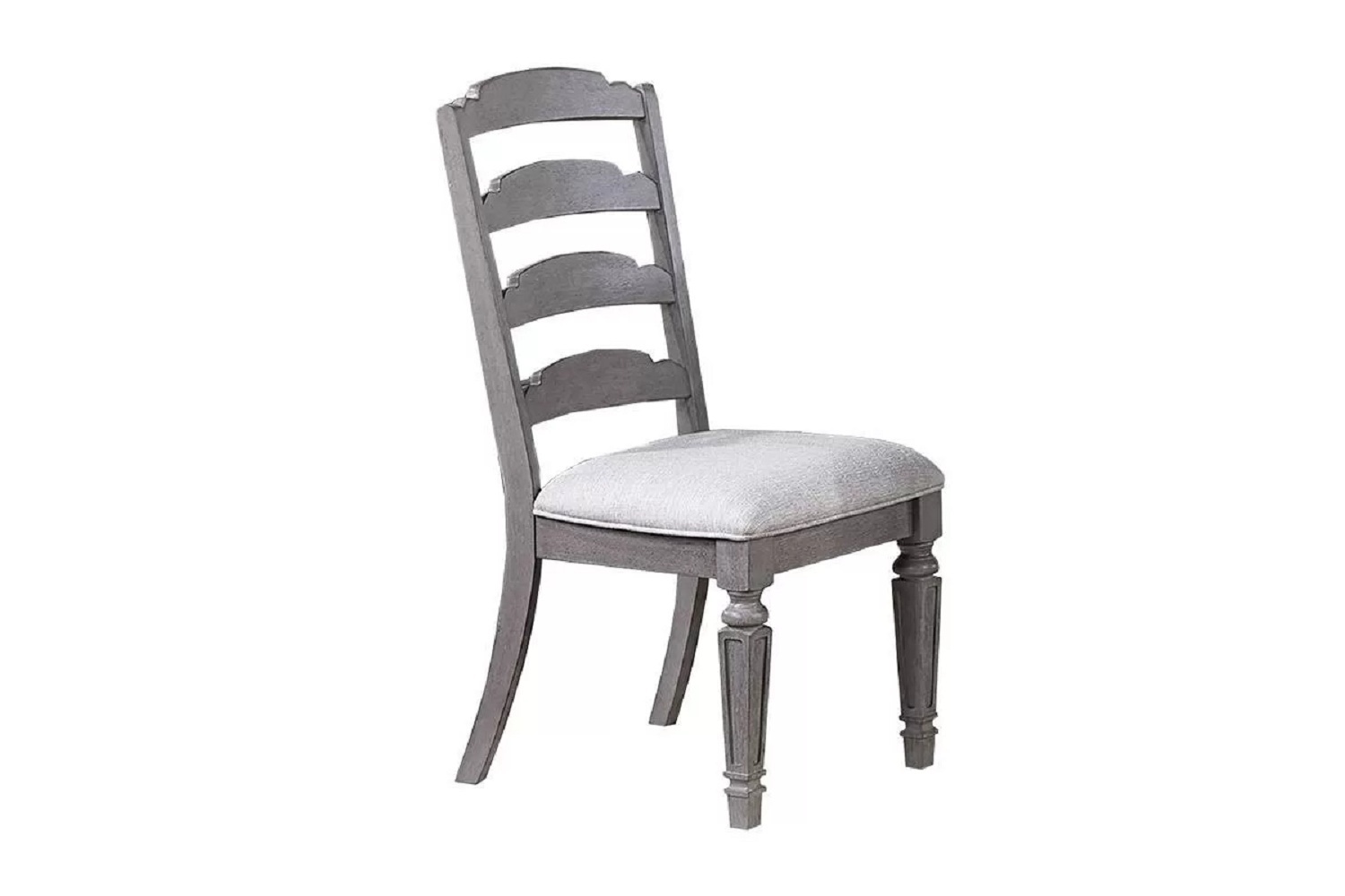The matching dining chairs have a ladder-back design and upholstered cushions, offering both comfort and a stylish look.