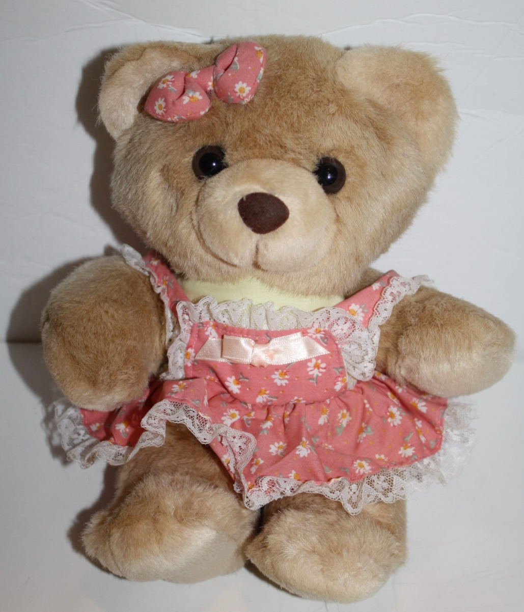 Walmart Teddy Bear 9" Beige Plush Peach Pinafore Flower Dress Bow Soft Toy Sits