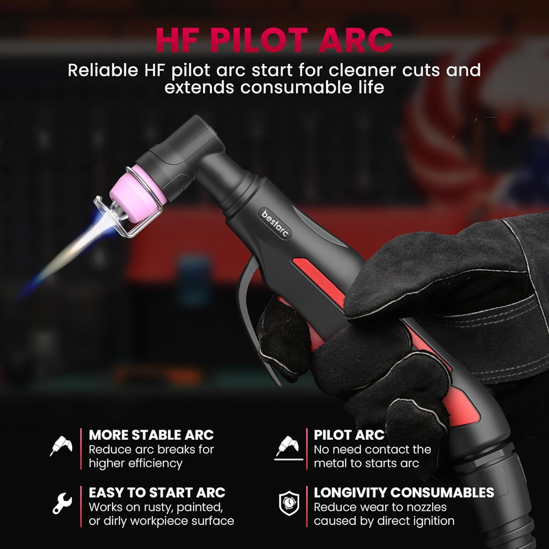 [Pilot Arc]: bestarc plasma cutter with the pilot arc function. It is a high-frequency non-touch arc starting mode. The torch head does not need to touch the metal plate, making it effective on rusted, painted, or dirty metal surfaces. Adjustable PA function for extended pilot arc duration, reduced energy consumption in non-cutting work, reduced electrode burning, and extended consumables cutting life.