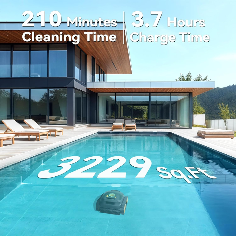 Extended Battery Life Quick Charging: Equipped with a long-lasting battery, this cordless pool robot vacuum runs up to 210 minutes on a single charge, covering larger areas with ease and reducing filter basket maintenance. Fast-charging capability refuels the battery in just 3.7 hours, minimizing waiting time