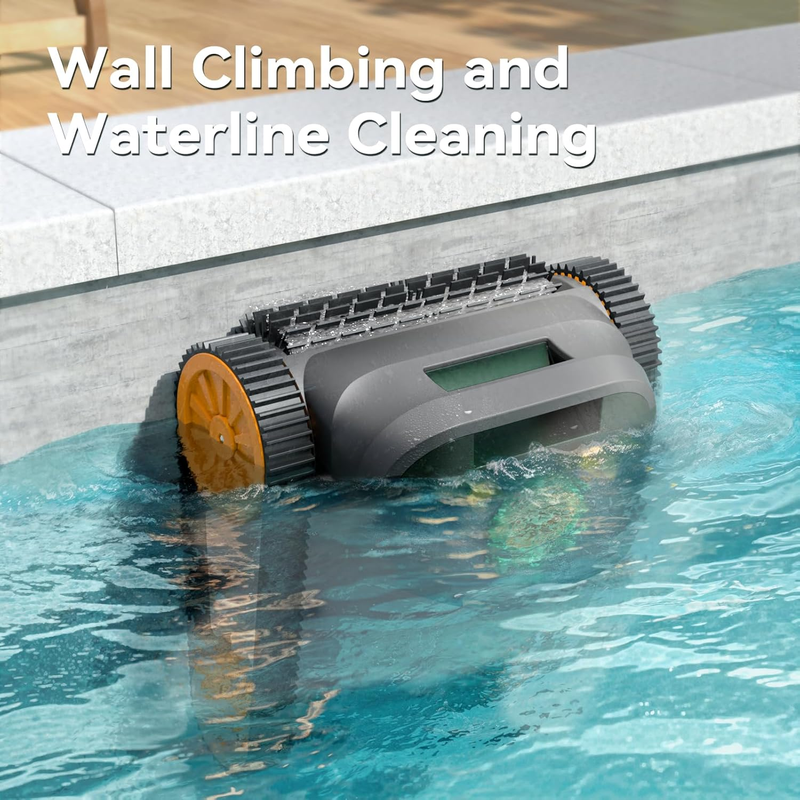 Reliable Wall Climbing Obstacle Handling: Equipped with high-traction tracks, this pool vacuum robot effortlessly climbs walls, cleans waterlines, and navigates uneven surfaces, tight corners, drains, and slopes up to 108 with ease