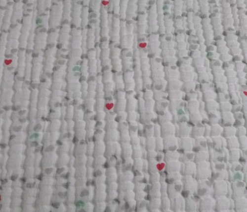 Made from 100% cotton muslin, this aden + anais Dream Blanket features a charming heart pattern on a white and gray background.
