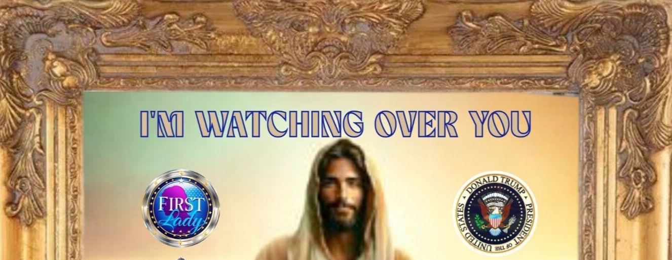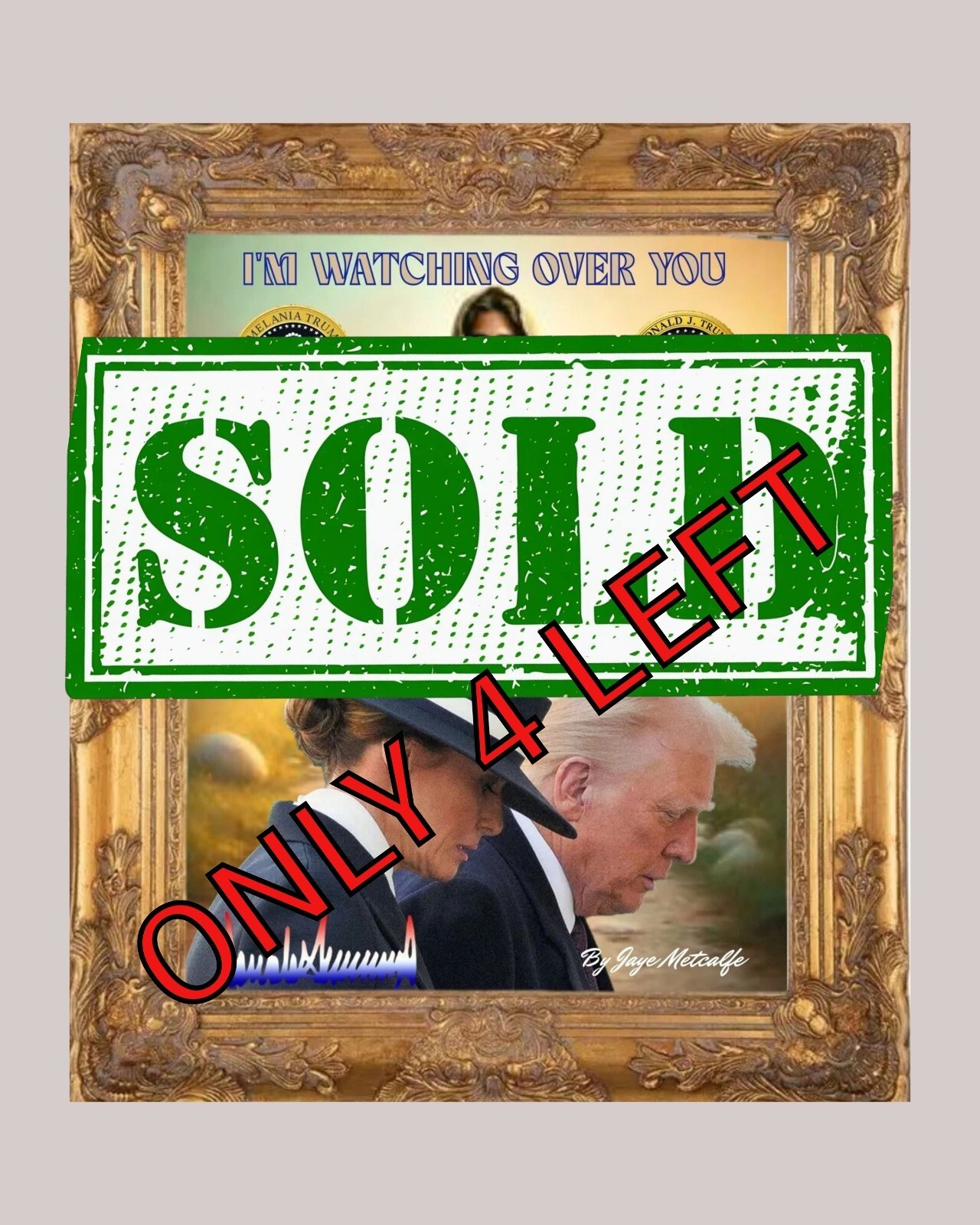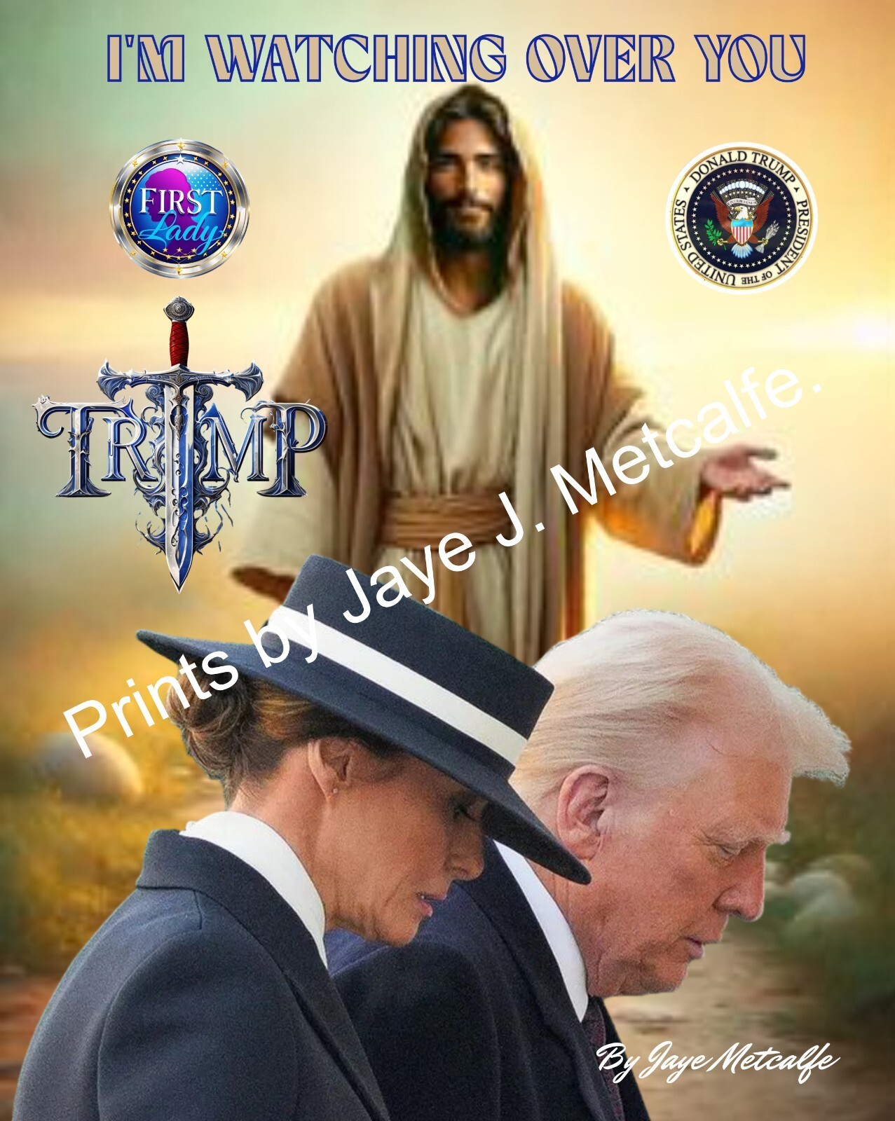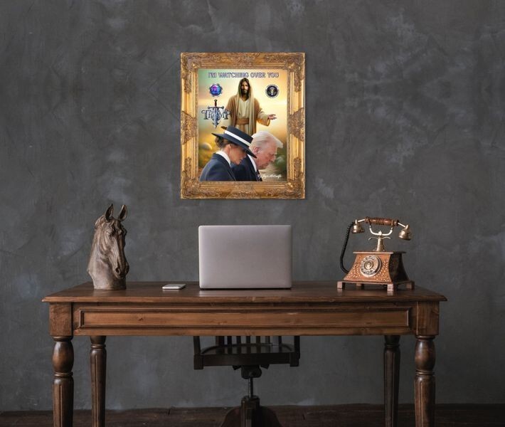 The product is a wall art piece featuring the message "I'm watching over you Donald and Melania Trump." This limited-edition art piece features a stunning print of Donald and Melania Trump. Perfect for collectors and fans of the Presidential couple, this special edition is a must-have. Made in the United States, this art piece is a one-of-a-kind and will be a great addition to any collection.