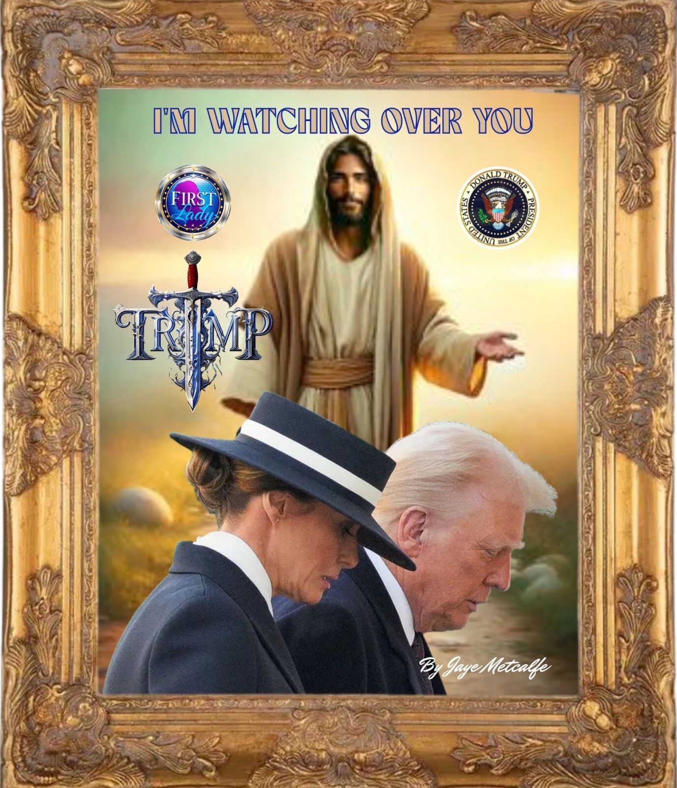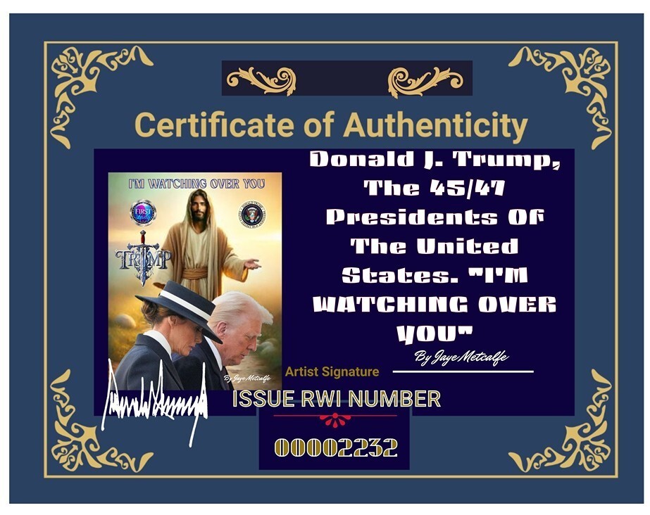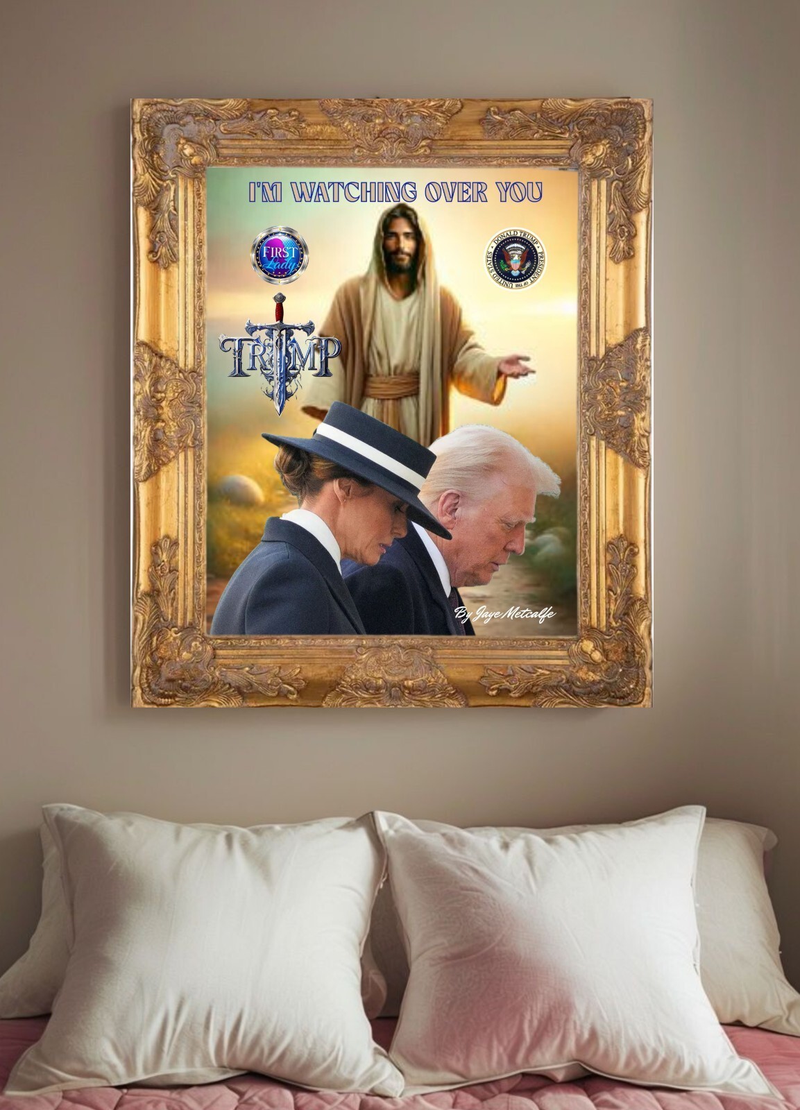 The product is a wall art piece featuring the message "I'm watching over you Donald and Melania Trump." This limited-edition art piece features a stunning print of Donald and Melania Trump. Perfect for collectors and fans of the Presidential couple, this special edition is a must-have. Made in the United States, this art piece is a one-of-a-kind and will be a great addition to any collection.