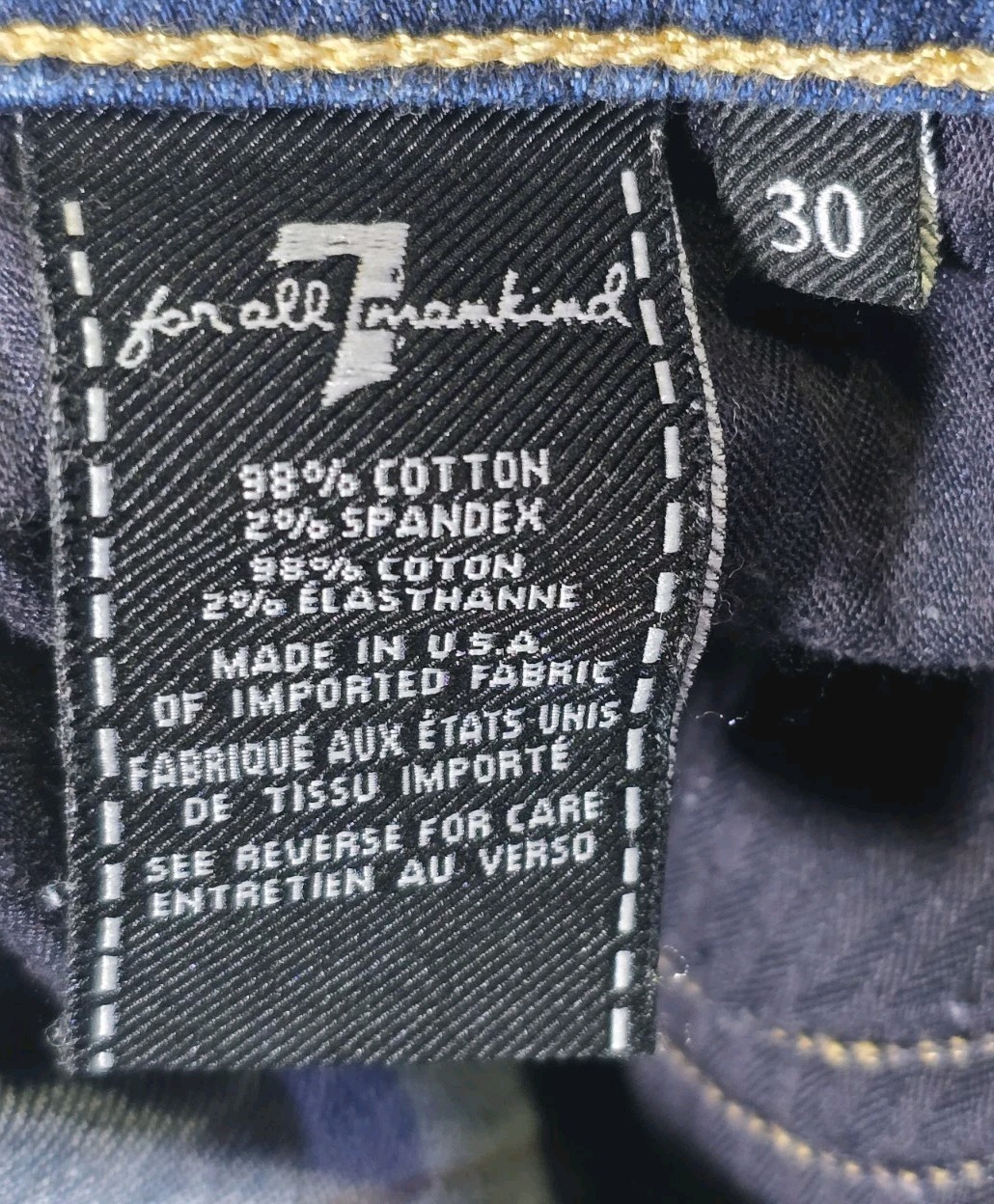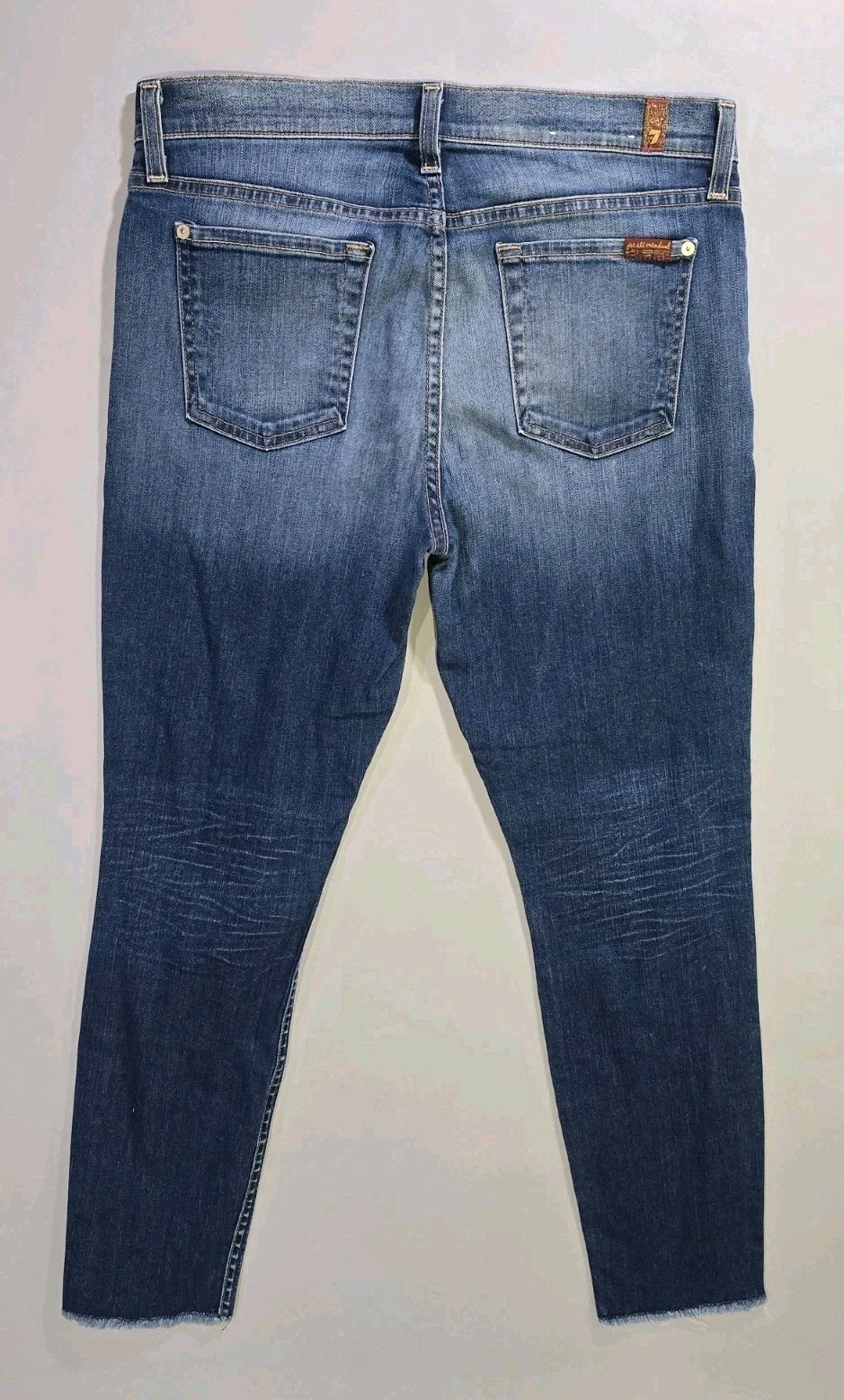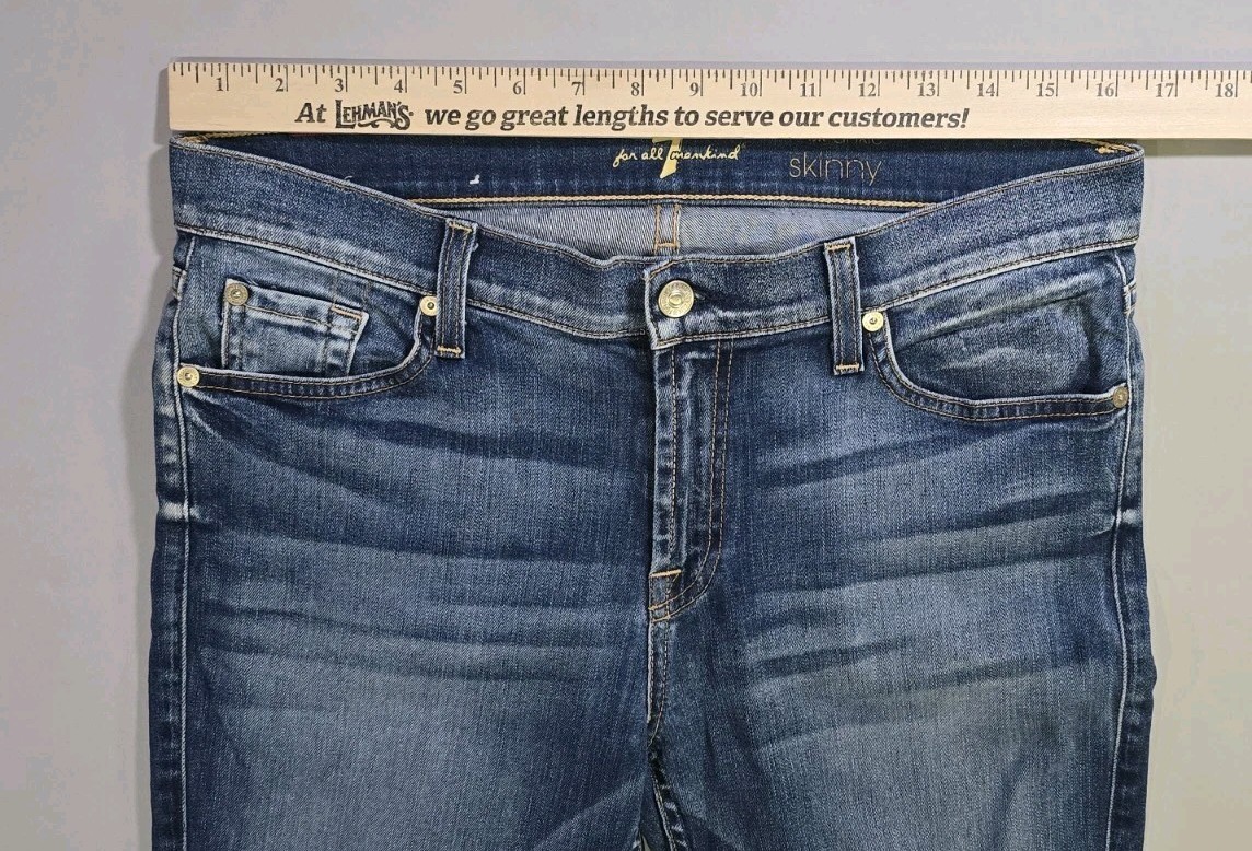 The product is a pair of 7 For All Mankind ankle skinny jeans in size 30, made from a stretch denim fabric in a solid blue color. Featuring a slim fit, mid-rise waist, and 5-pocket design, these jeans are machine washable and have a zip and button closure. The brand's signature accents like buttons, zippers, and logos are incorporated into the design. Perfect for various seasons and occasions, these jeans offer both style and comfort for the modern woman looking for a versatile wardrobe staple.