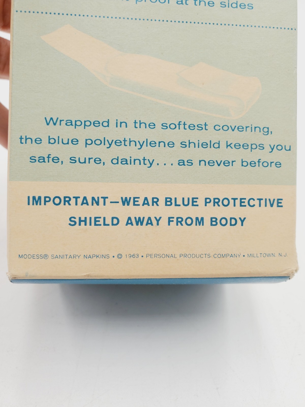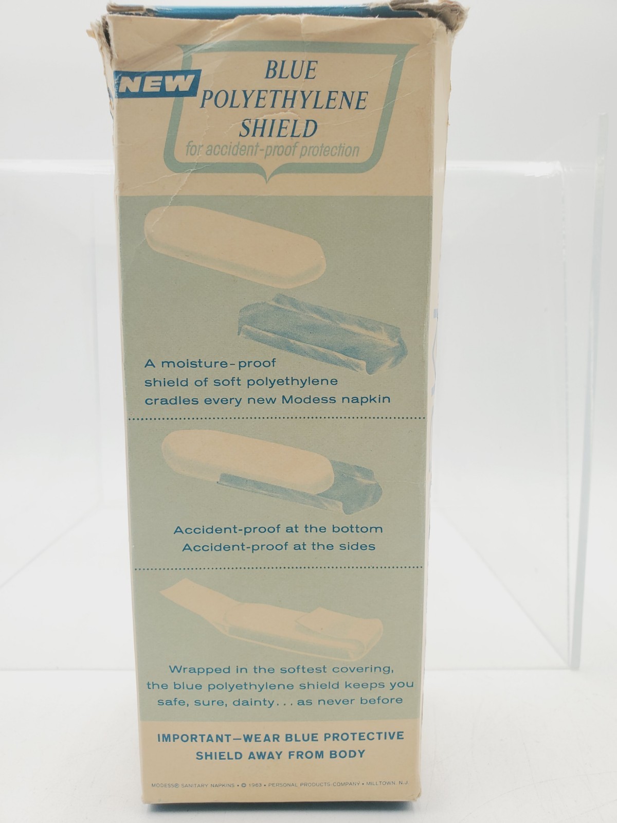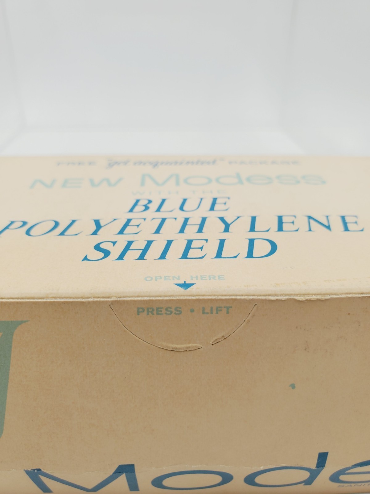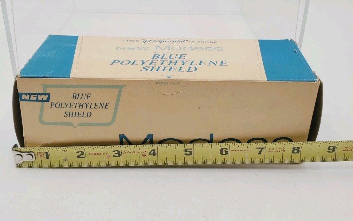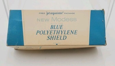 NIB Vintage 1963 Modess Get Aquainted Package 4 Pack Period Menstrual Shields. Open box, but unused. Looks like box came open on one side. Box and graphics in great condition. Please review photos for item details. Give me a follow as I list from estate sales for new and vintage items.