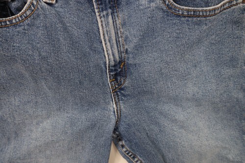 Thread bare fly, pockets. Discolored. Distressed and faded. Made in USA