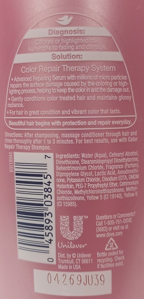 1 Brand New Unsealed Unboxed Full Size Bottle by Dove Our Best Formula Ever! Color Repair Therapy CONDITIONER for Colored or Highlighted Hair With Repairing Serum! Original Formula! 100% Authentic! Discontinued and Hard to Find! RARE!