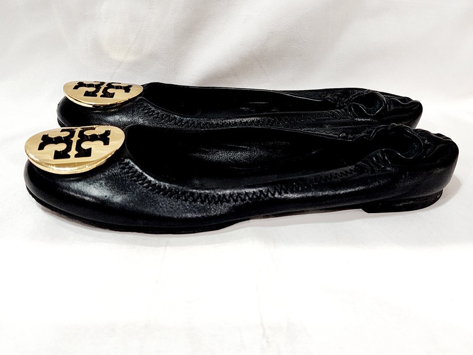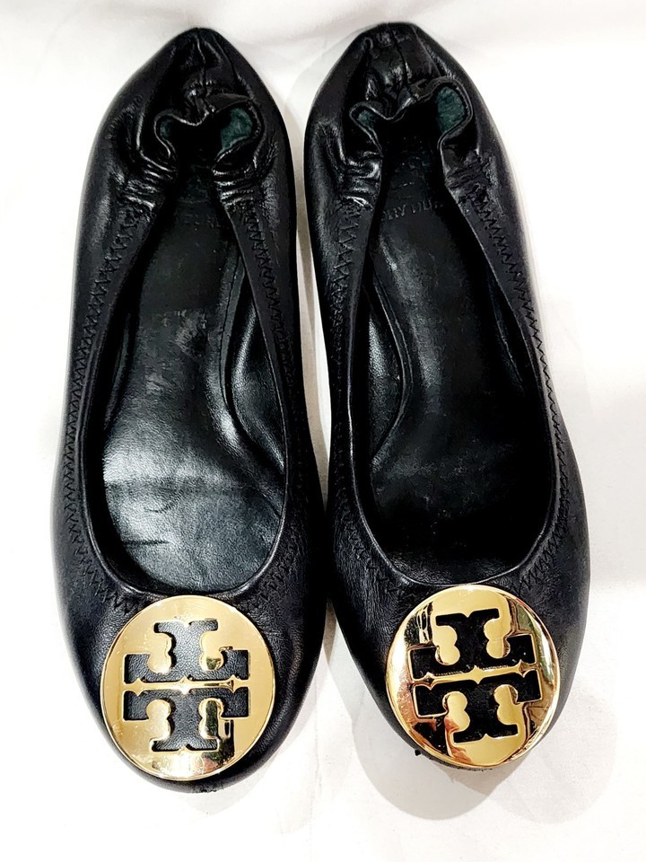 1 Slightly Used No Box By Tory Burch REVA Black Leather Flat Ballet Classic Medallion Gold Logo 5 M Used! (Box #16)