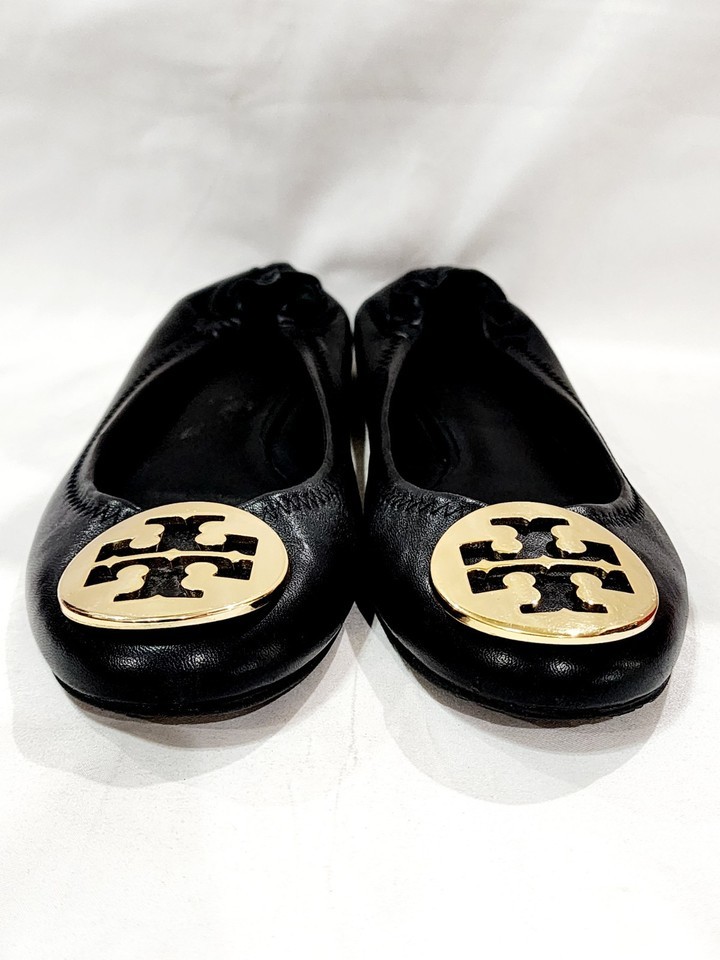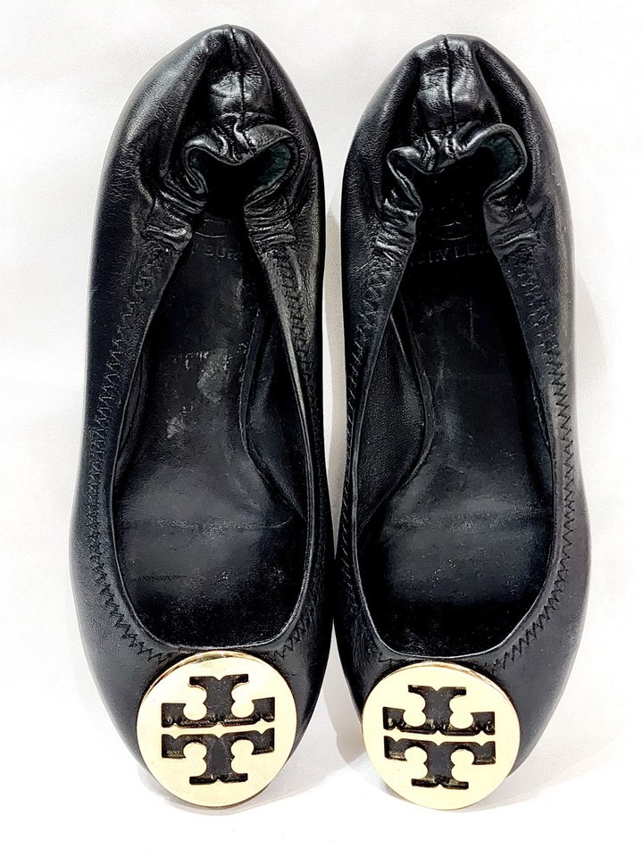 Tory Burch REVA Black Leather Flat Ballet Gold Logo Medallion Classic 5 M Used