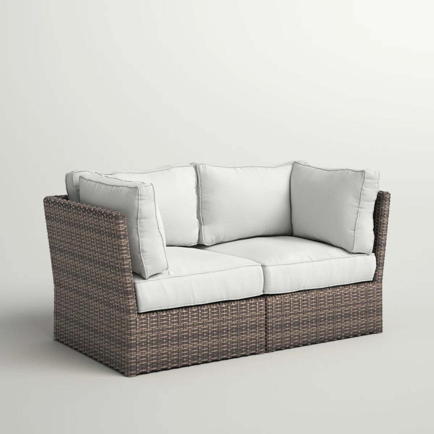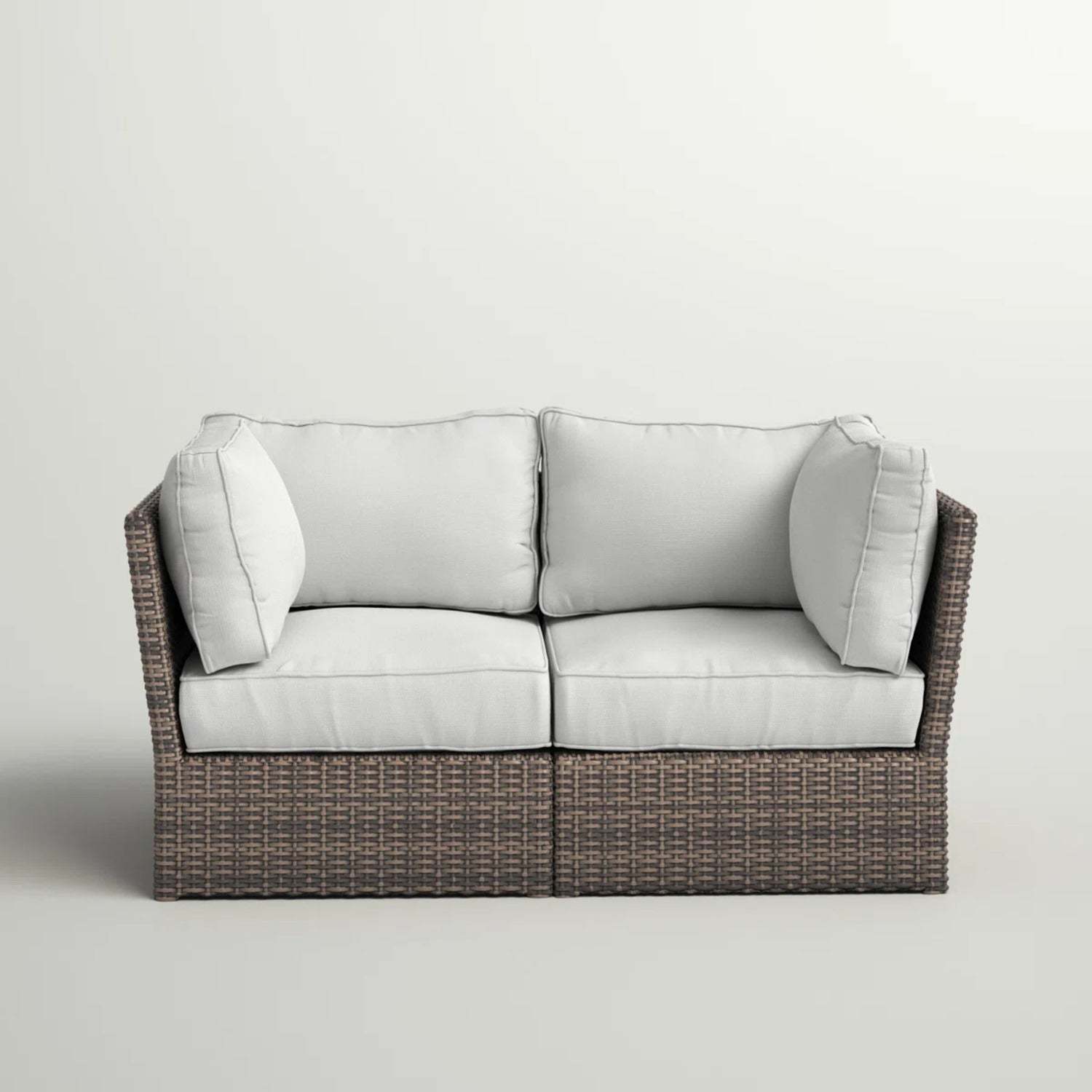 Add modern comfort to your outdoor space with this fully assembled modular loveseat, perfect for patios, porches, or sunrooms. Crafted from a durable aluminum inner frame and wrapped in HDPE wicker, this loveseat features two corner pieces that fit together seamlessly to seat two people comfortably. Six generously padded cushions, upholstered in gray yarn-dyed acrylic with water- and UV-resistant properties, provide exceptional support and style. With its mildew- and rust-resistant construction, this piece is built for year-round outdoor use. Whether you?re relaxing solo or sharing the space, this loveseat is designed to elevate your open-air lounging experience?no assembly required.