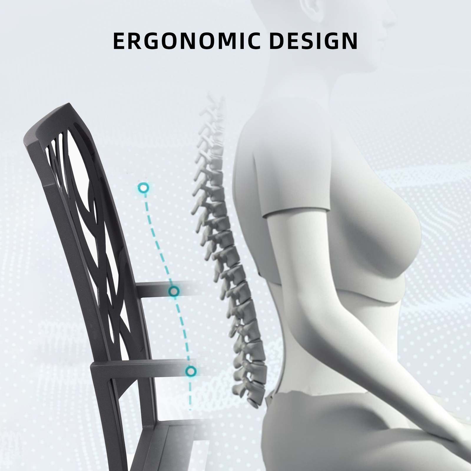 The curvature of the chair's backrest conforms to ergonomic principles, providing excellent support for the human back.