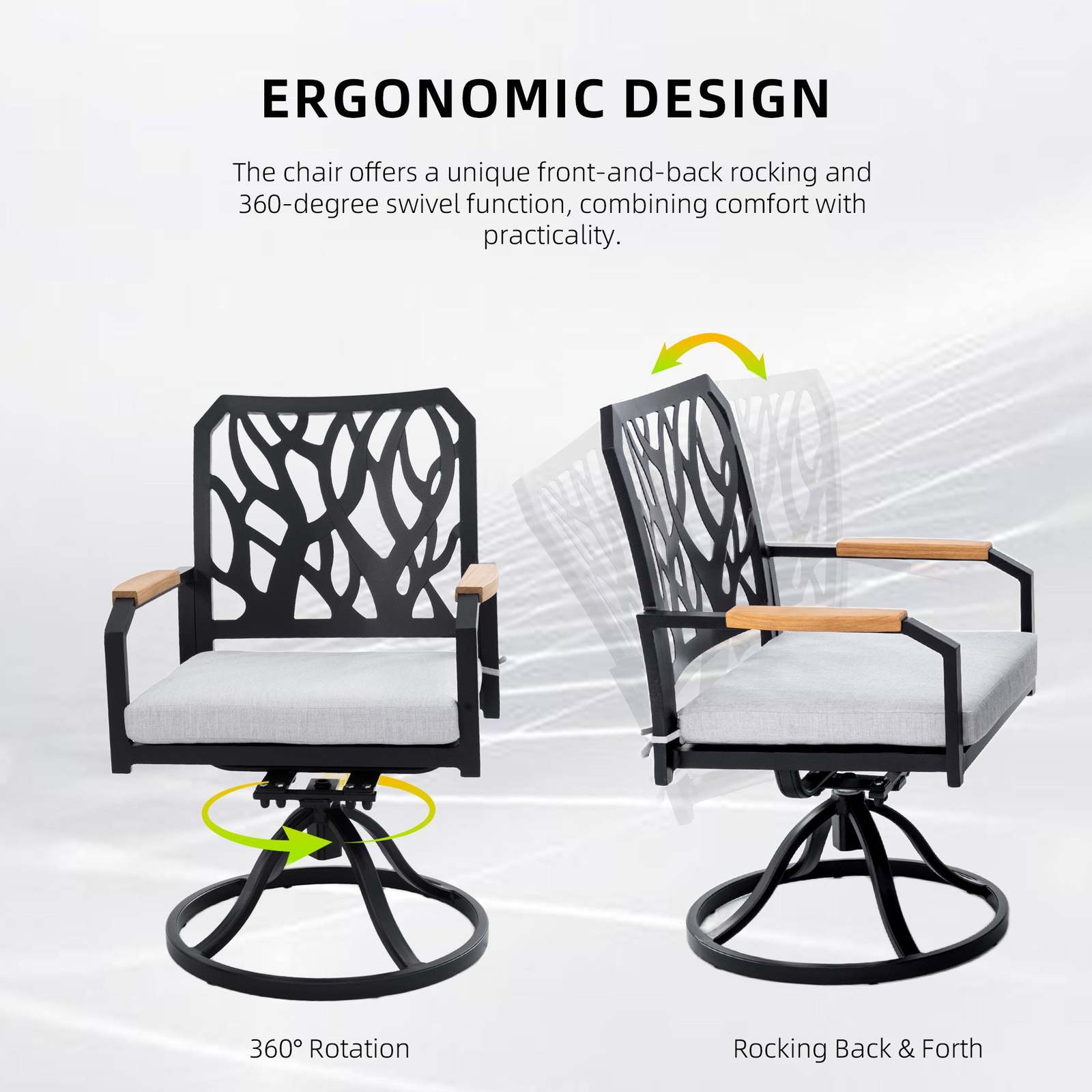 The chair offers a unique front-and-back rocking and 360-degree swivel functio