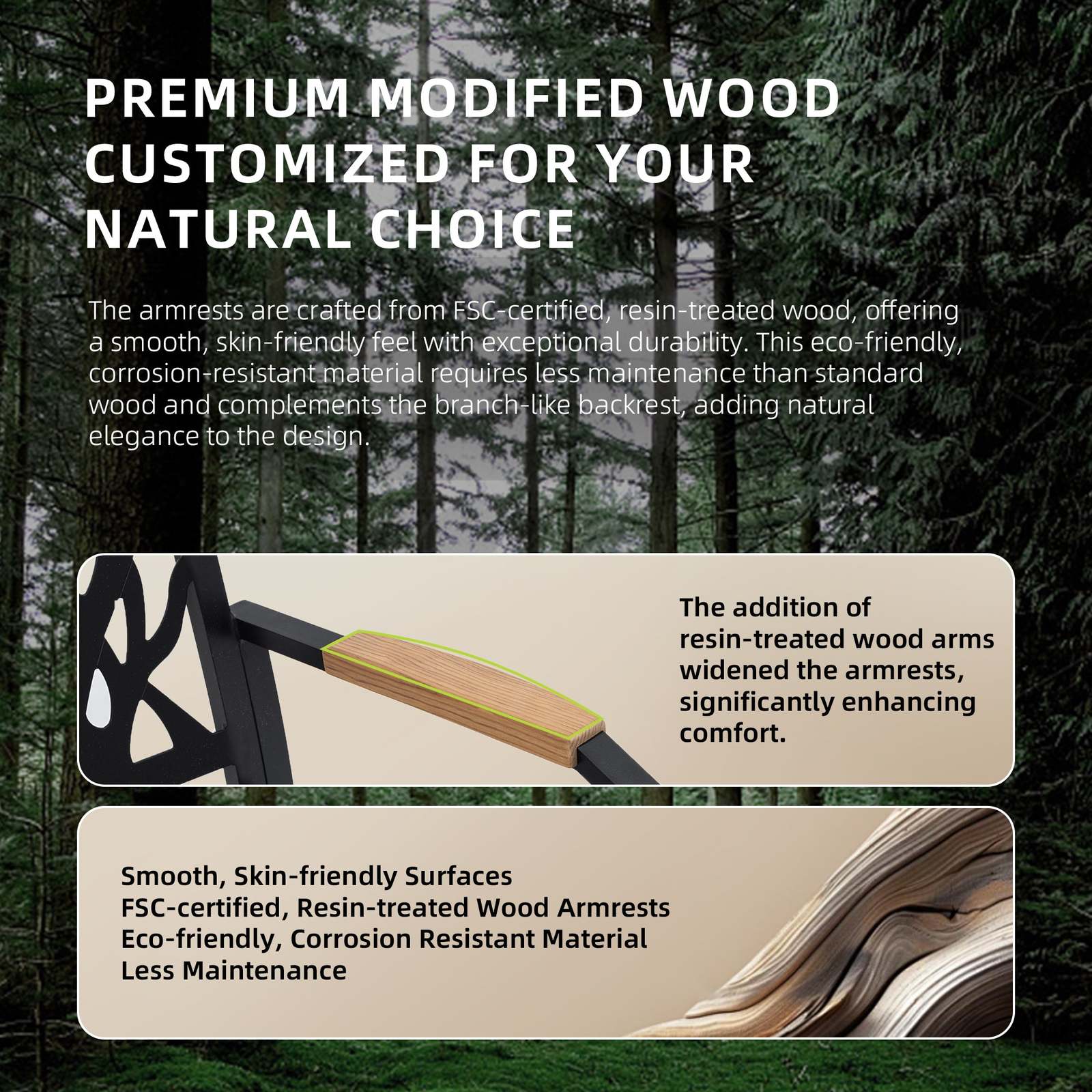 The armrests of this chair are crafted from FSC-certified, resin-treated wood, providing a smooth, skin-friendly feel with exceptional durability. This eco-friendly material is E0-grade, and is highly corrosion-resistant, requiring far less maintenance than standard wood. Designed to complement the branch-like backrest, these armrests add natural elegance to the chair?s design.