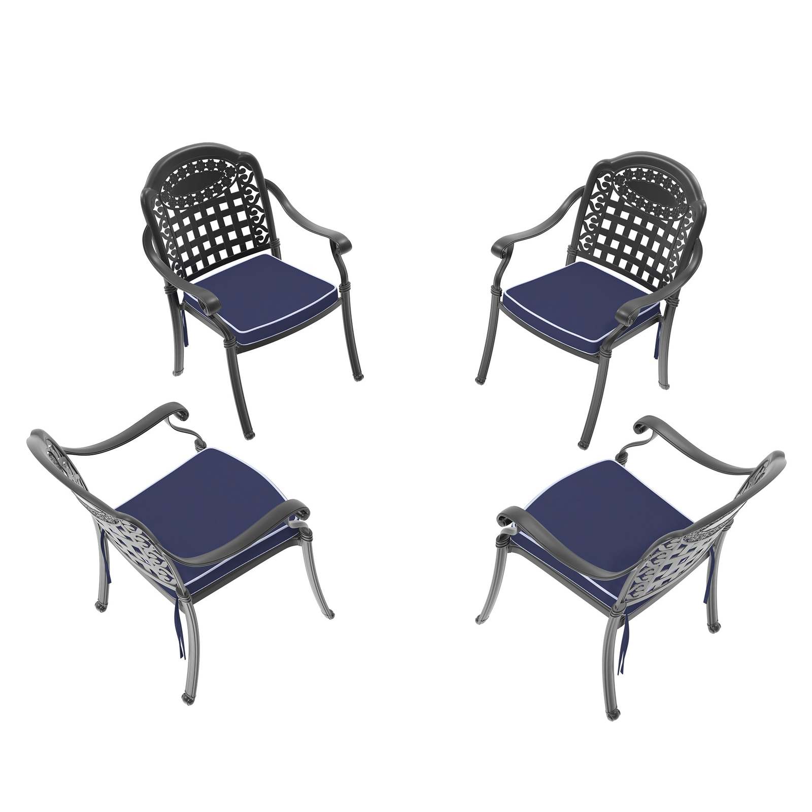 4PC Cast Aluminum Patio Dining Chairs Set: Black Frame, Blue Cushions