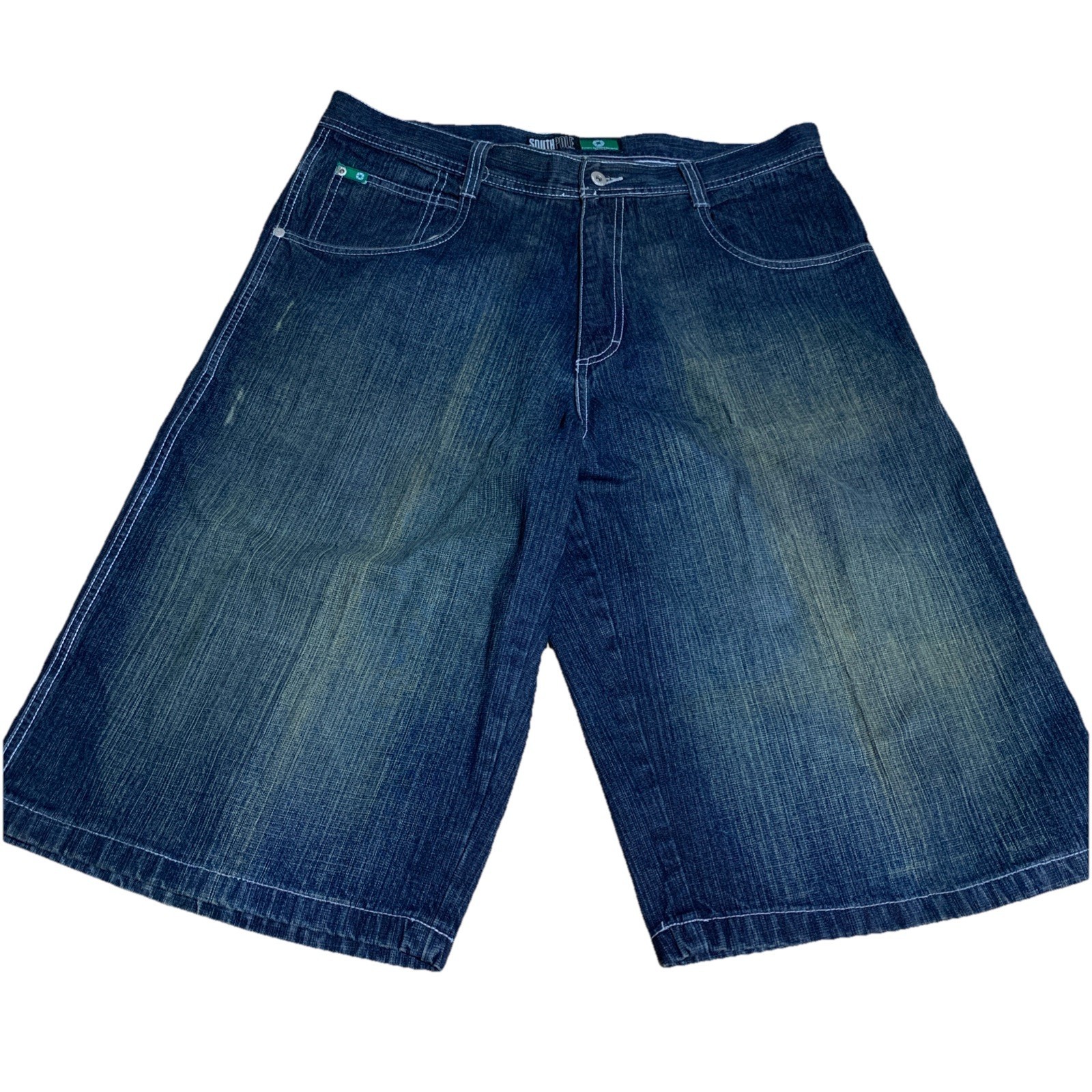 The product is a pair of vintage Southpole jeans shorts for men in size 38. These denim jorts feature a wide, baggy fit typical of hip hop and skater styles from the Y2K era. The shorts are made of cotton fabric with a solid blue/green color and medium wash. They have a zip closure, flat front, and 5-pocket design with various accents like buttons, zippers, and logos. Ideal for casual occasions in the summer, fall, or spring, these relaxed fit Bermuda shorts are easy to care for and machine washable.