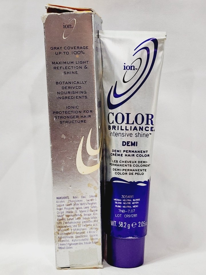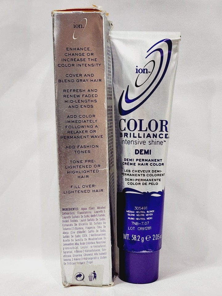 1 Brand New Factory Sealed In Original Damaged Box Full Size Tube by Ion Color Brilliance Intensive Shine 7NB-7.07 MEDIUM NEUTRAL BLONDE Demi-Permanent Creme Hair Color! No Amonia! #305491! Believable Blondes! Original Formula! Discontinued Hard to Find! 100% Authentic! RARE!