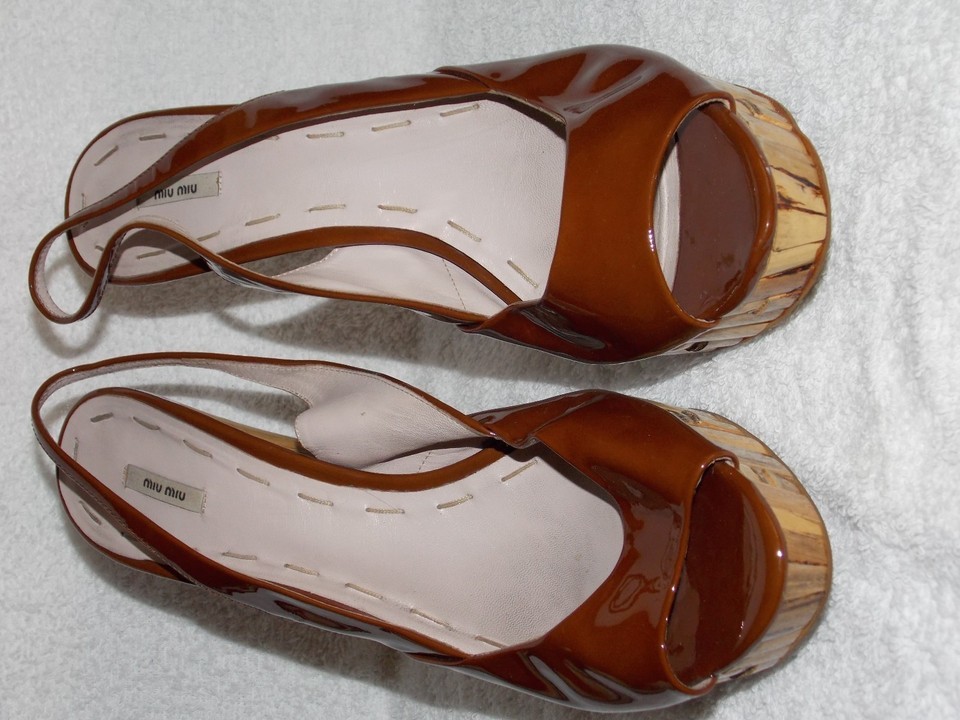 1 Pair No Box Pair By Miu Miu Patent Leather Brown PEEP TOE Bamboo Heels For Women (box #19)