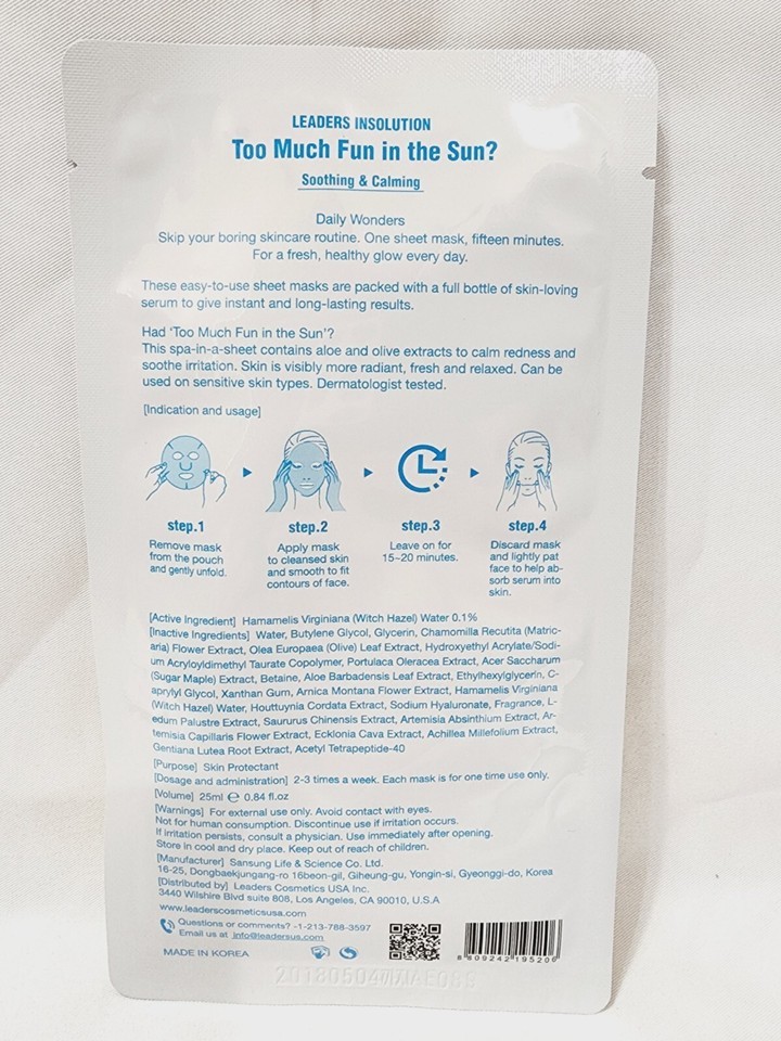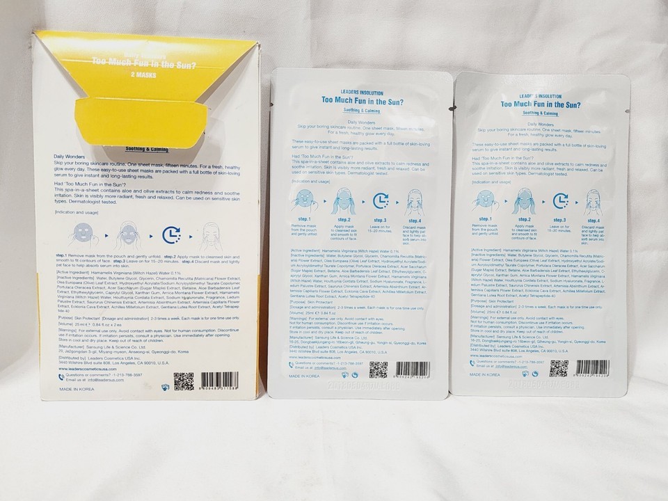 Leaders Insolution 2 MASKS Too Much Fun In Sun Soothing Calming Skin Daily New