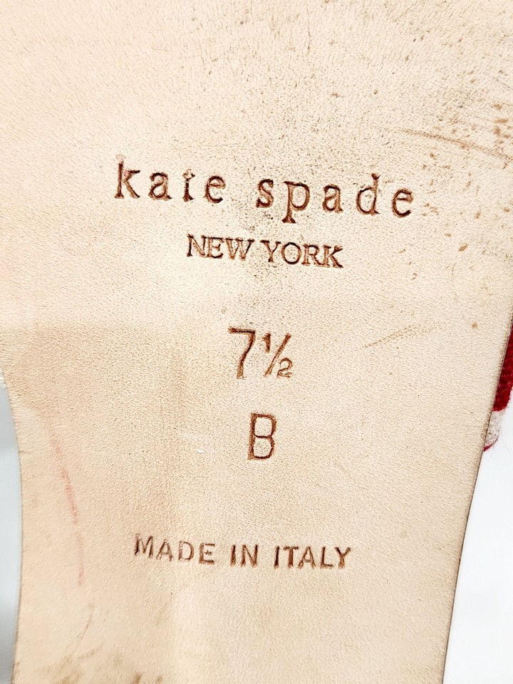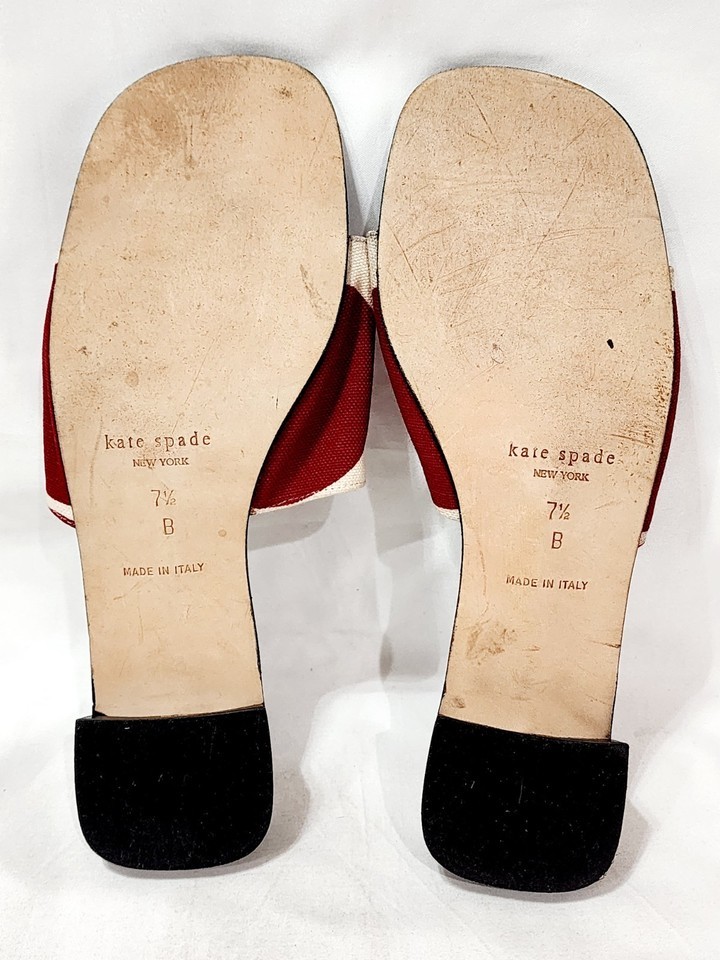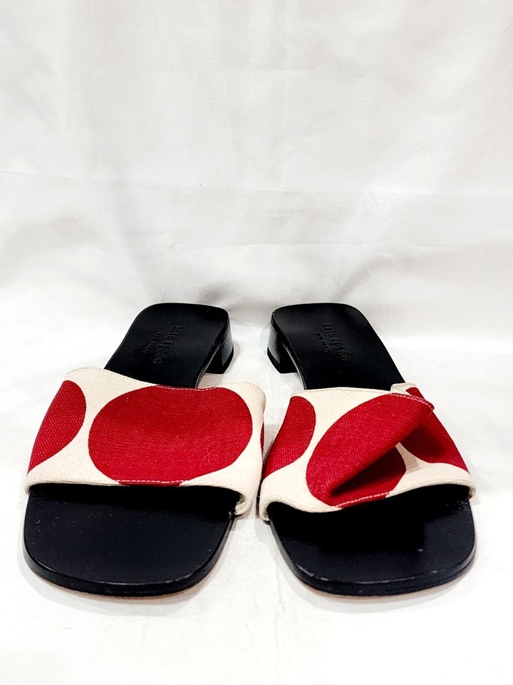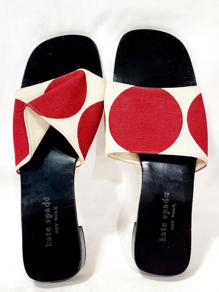 1 New Pair with Scratches/Scuffs On Bottom of Soles No Box By Kate Spade New York RED POLKA DOT Ivory/Off White Black Fabric Canvas Cloth Linen Slide Sandal 7.5 B New (Box #17)
