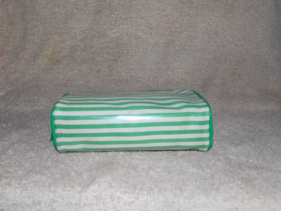 YOU ARE BIDDING ON 1 Brand New By Bare Escentuals GREEN STRIPED Plastic Coated Top Zipper Cosmetic Makeup Bag!"