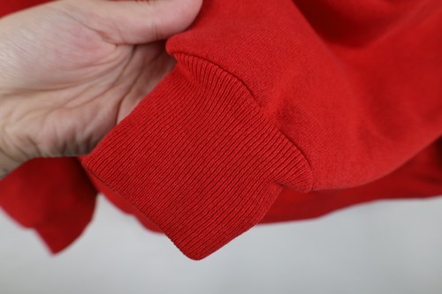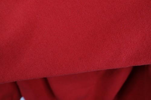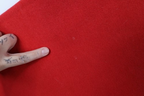 Stains front, arms. Bleach blemishes right arm. Design distressed, loose threads. Collar, cuffs discolored. Color faded. Pilling
