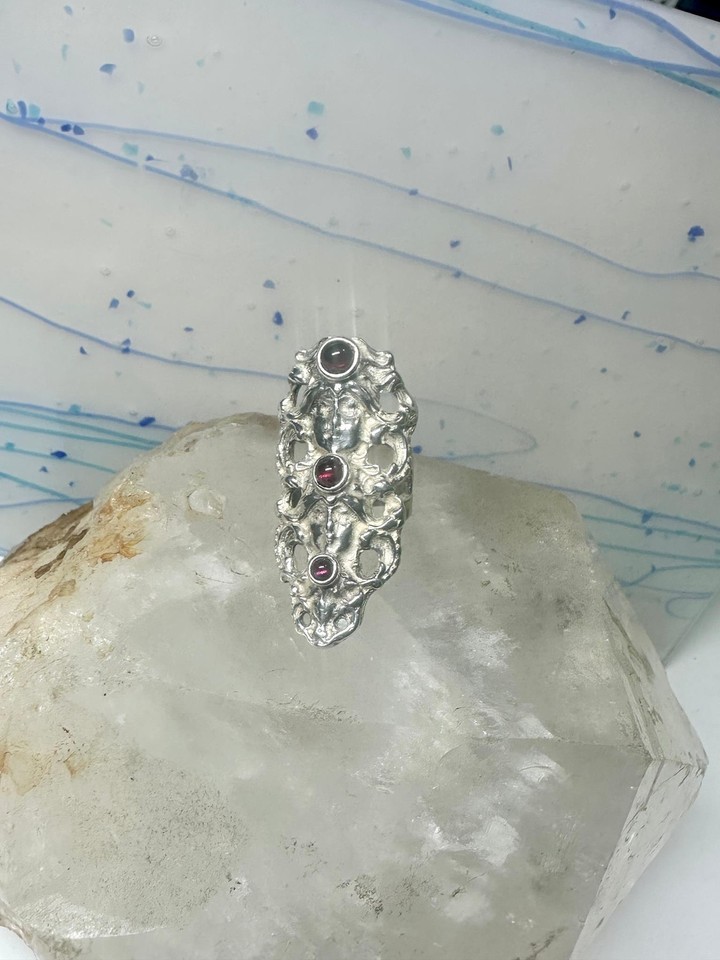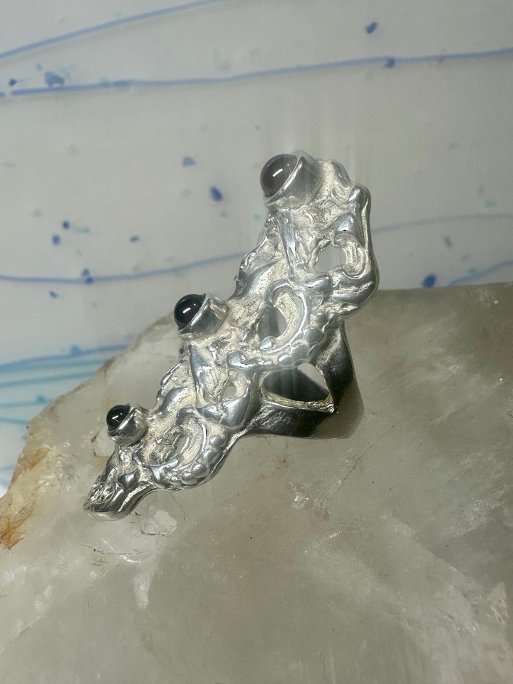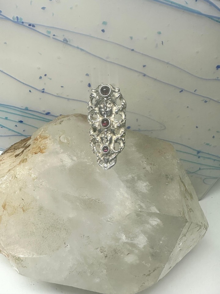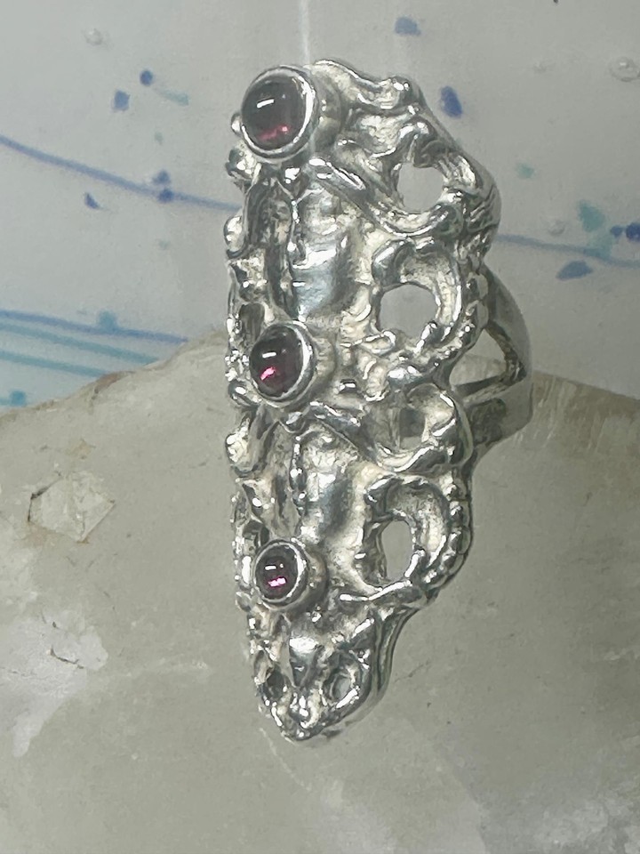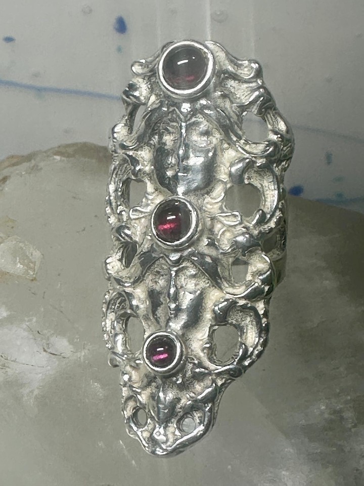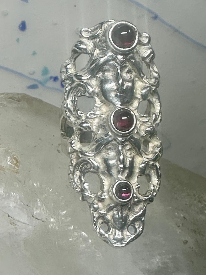 Face ring long figurative Art Deco influences garnets size 5.75 sterling silver women