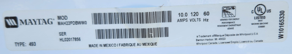 MAYTAG COIN OPERATED FRONT LOAD WASHER MODEL MAH22PDBWW0 SERIAL NO HL02017856[REF]