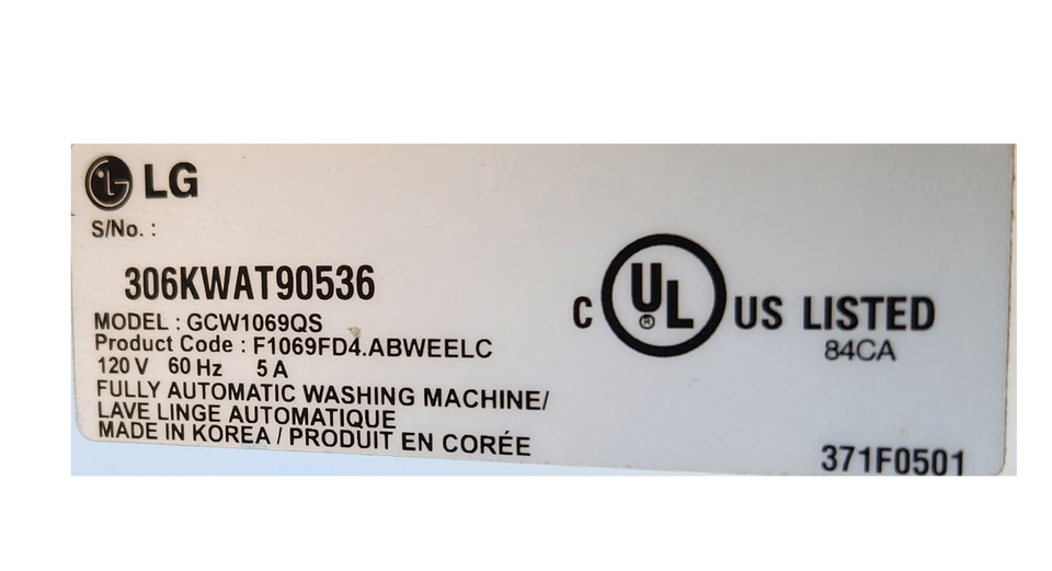 LG COIN OPERATED FRONT LOAD WASHER MODEL 306KWAT90536 SERIAL NO F1069FD4.ABWEELC[REF]
