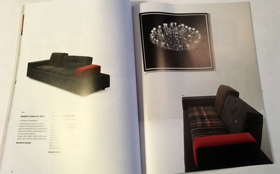 Notes: Minor shelf wear, binding tight, pages clean and unmarked. Catalog contains art, furniture and other home furnishings. Items for sale include several Warhol paintings, Steve Mccurry's Afghan Girl, Louis Vuitton trunks, Stilnovo hanging lights, George Nakashima chairs, Roy Lichtenstein Les Nympheas; Elsworth Kelly lithograph, Damien Hirst screenprints, Alexander Girad sofa; Helmut Newton photograph and many other items from iconic designers and artists.