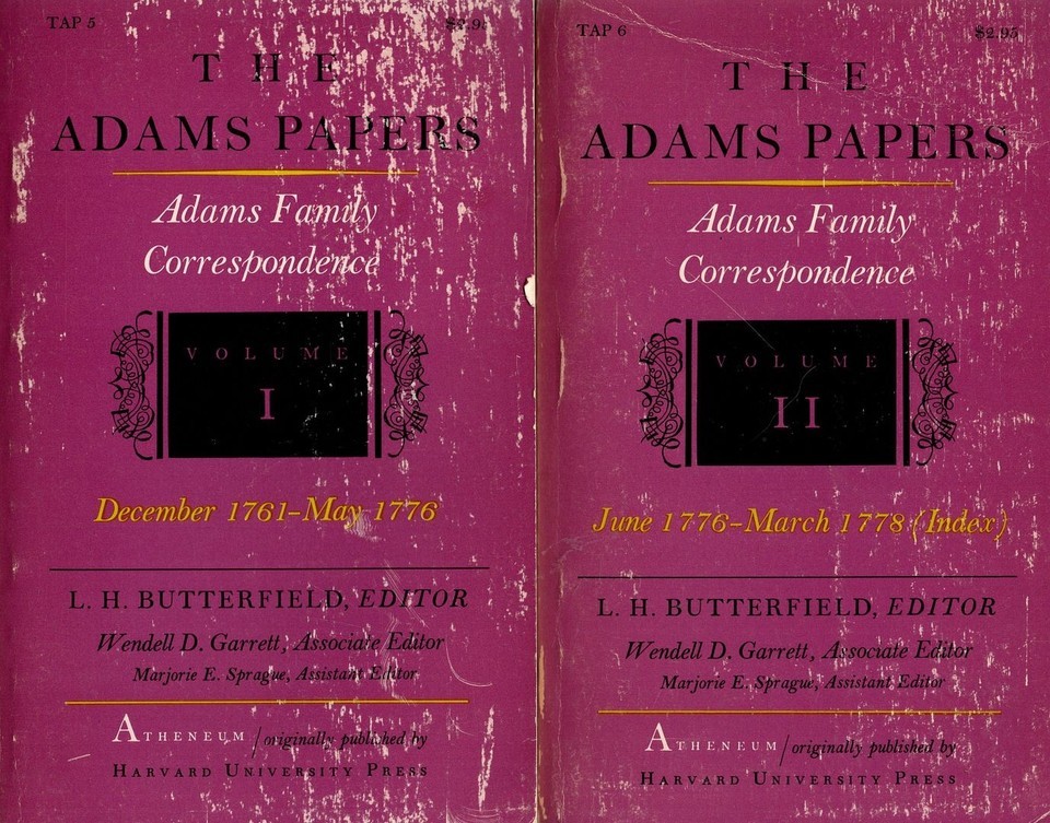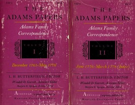 Notes: Covers are heavily rubbed, slight creasing, light wear to edges, bindings tight, front endpage has a name in ink, 2 small spots of staining, else pages unmarked, lightly age-toned. Originally published by Harvard Univ Press, this edition gives the complete Adams family correspondence in unedited form for December 1761-May 1776. John kept Abigail's letters, she kept his, they both kept their children's. Great primary souce material. Well indexed with lots of footnotes. Two volumes.