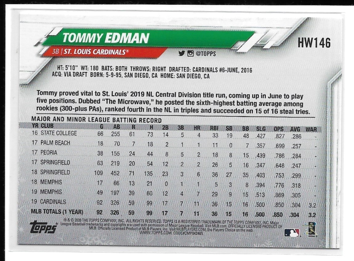 2020 Topps Holiday, Tommy Edman, #HW146, Cardinals